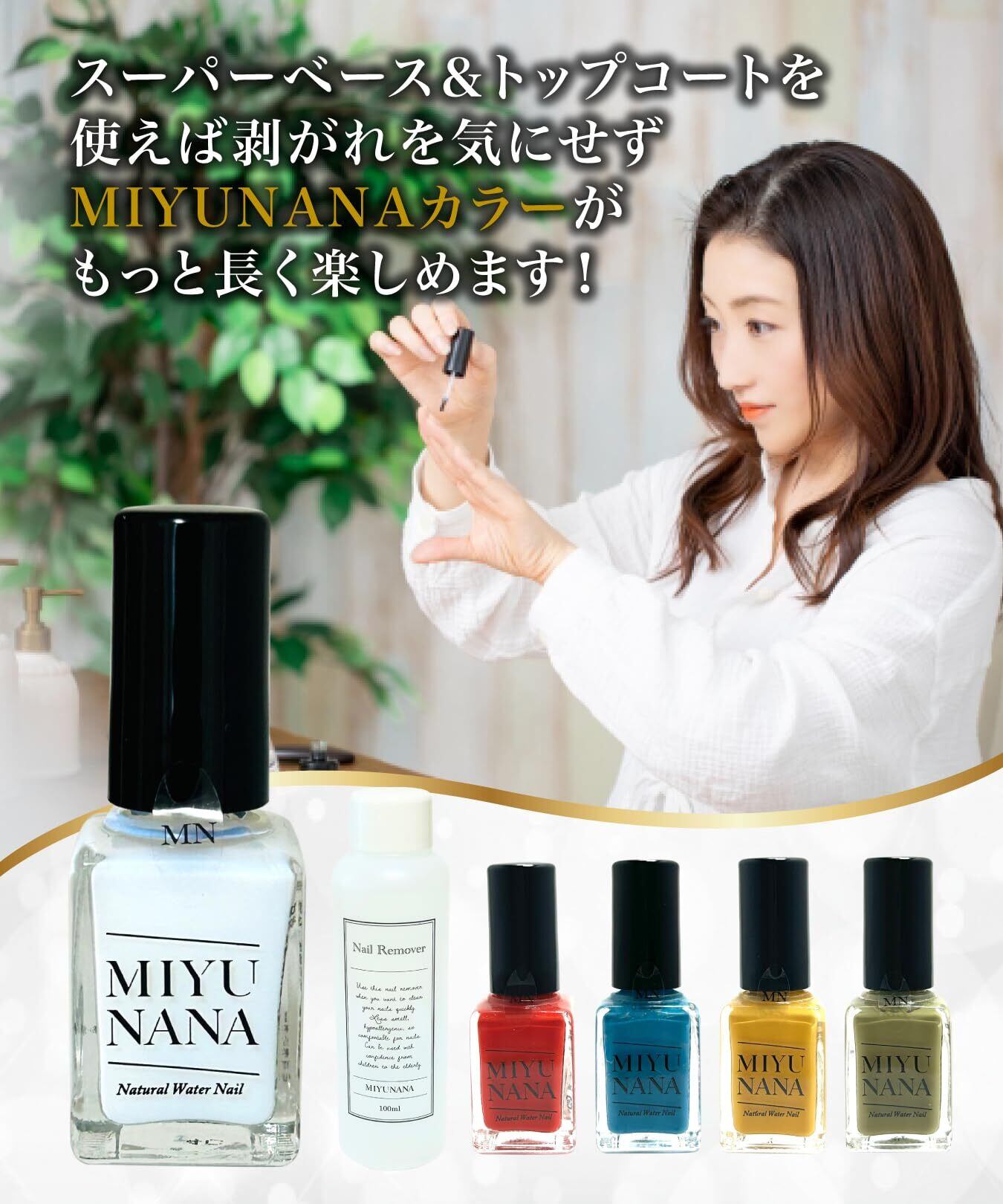 ナチュラルウォーターネイルの主要材は「水」と「ホタテの貝殻の成分」です。 貝殻真朱層に含まれるコンキオリンが、爪や肌に潤いを与え保湿効果を与ます。 同時に配合したヒアルロン酸も細胞の活性化を促し、 爪本来の輝きを取り戻し自然の輝きが蘇ります。 MIYUNANAは従来の有害なトルエンや酢酸エチルなどの有機溶剤を使わないので、 人にも環境にもやさしい自然派の水性ネイルです。