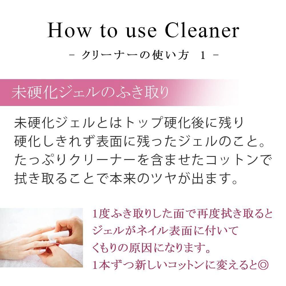 クリーナーは、未硬化ジェルのふき取り・油分の除去・ブラシの洗浄と 幅広く使用できます。