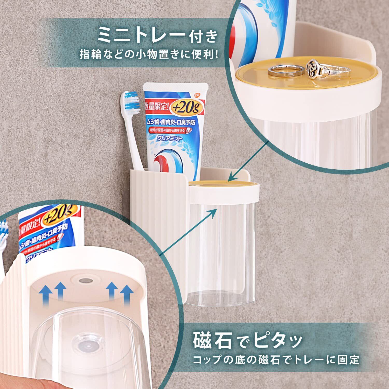 商品名:歯ブラシスタンド カップ・トレー付き ホワイトカラー:ホワイトサイズ:約7.4×12×11cm材質:ポリスチレン内容:1個生産国:中国【耐荷重】●1kg【特長】●うがいコップがセットになったミニトレー付きで使い勝手の良い歯ブラシスタンド。●コップは逆さまにすることで、磁石でミニトレーにくっつくので水切りできて清潔。●ミニトレーには指輪やヘアピンなどの小物が置けて便利。お風呂場などで使っても。●歯ブラシだけでなく、歯磨き粉やスキンケアグッズ、カミソリなども入れておける。【固定シールの使い方】●1.取り付けたい場所をよく拭いてきれいにします。●2.固定シールの保護シートをはがし壁に貼り付けます。●3.貼り付けた固定シールを手で押さえて空気を抜きます。●4.固定シールの位置に合わせて本体を差し込みます。※木製や白塗りの壁などなめらかでない面への取り付けは適していません。【ご注意】●本来の用途以外でのご使用はお控えください。●固定シールは一度貼り付けると剥がれにくいため、取り付け位置をよくご確認の上ご使用ください。●固定シール貼り付け後は、密着性を高めるために24時間以上経過してからご使用ください。●落下・破損するおそれがありますので耐荷重以上のものを載せたり、強い力をかけたりしないでください。【ASTRO CO., LTD】1970年創業、不織布収納日用品メーカーとして「アストロ」のオリジナル商品を販売しています。生地の開発から製造、流通、品質管理を自社管理。収納用品をメインに多彩な日用品を企画販売してまいりました。アストロは暮らしを楽しく便利にさせる商品をこれからも創造し続けます。established in 1970