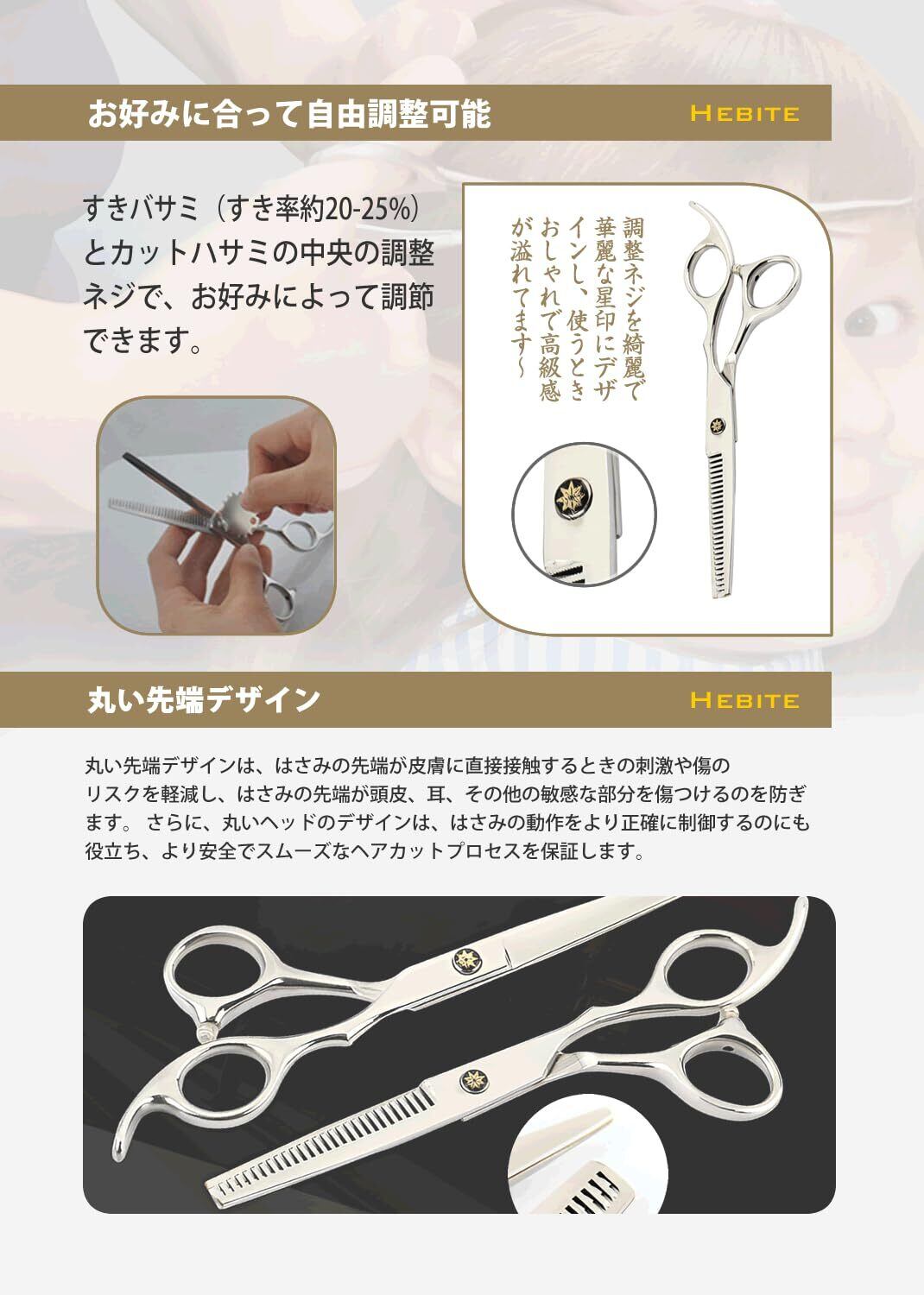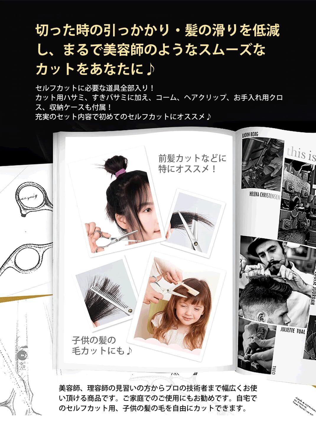 【商品内容】カットハサミ ×1、すきバサミ ×1、コーム ×1、ヘアクリップ ×2、収納ケース ×1、お手入れ用クロス×1、錆止め油×1、調整金具×1