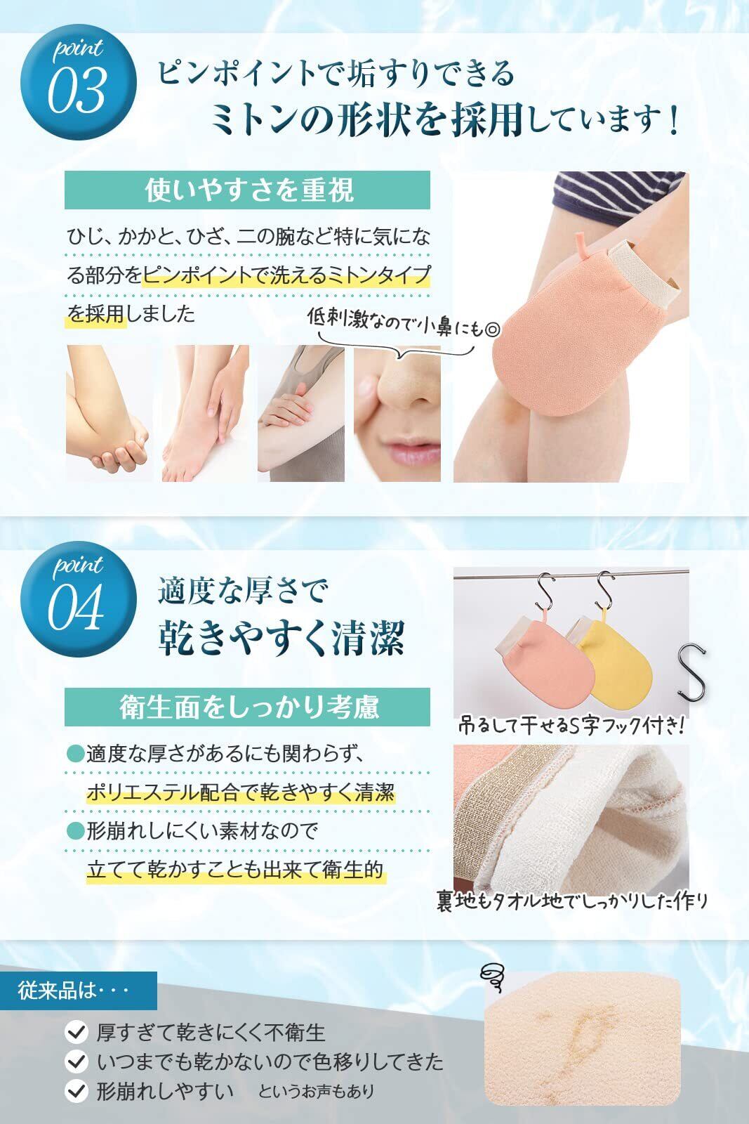 【現役ビューティーアドバイザー監修】『つるんと感動素肌』は、美容のプロが監修した製品です。①上質レーヨン素材で毛穴の汚れを取り、心地よい肌触りに!②ひじやかかと等、気になる部分も洗いやすいミトンタイプを採用!低刺激で小鼻にも使えます。③乾きやすさにもこだわり衛生的!タオルハンガーに掛けられるS字フック付き。④手にフィットするサイズ感。男性の方にも使いやすいワイドな作りに改良しました。
