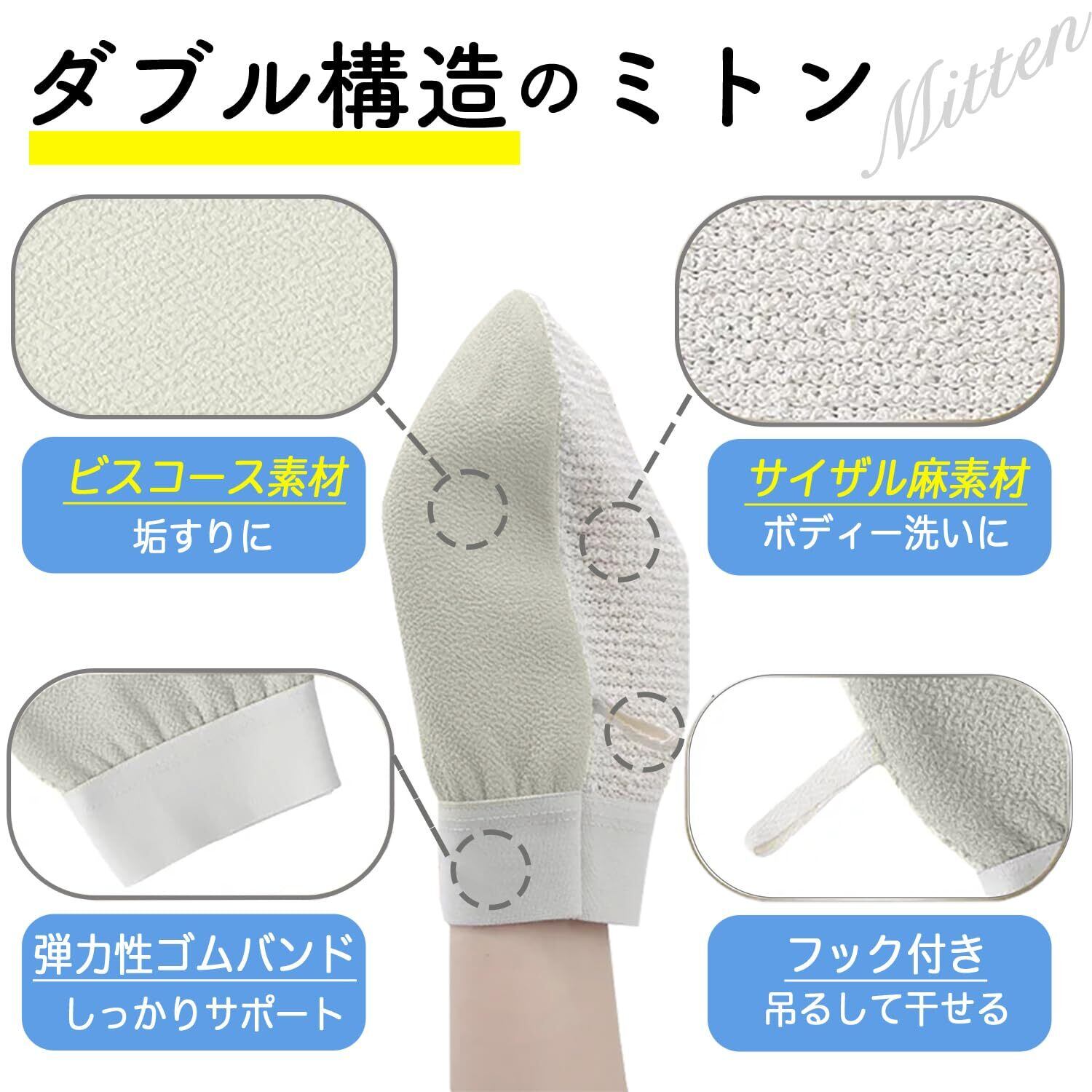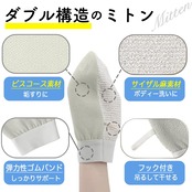【2面生地構造】垢すりベルトだけでなく、垢すりミトンも2面生地構造。(ビスコース生地 + タオル生地(垢すりベルト) / サイザル麻生地(垢すりミトン))。垢すりだけでなく、ボディー洗いにもオススメ。