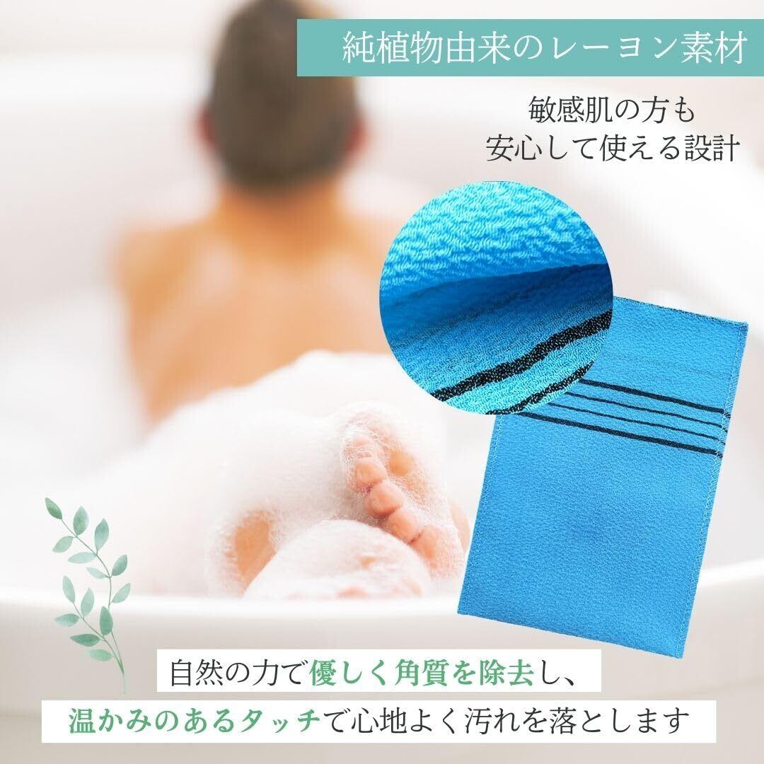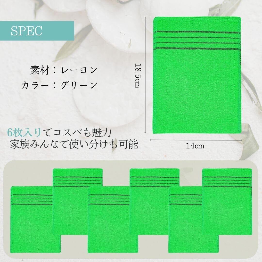 【肌悩み、さよなら。】ボタニカルレーヨン素材を採用した、肌に優しいあかすりグローブ。手袋タイプで隅々までケア、6枚入りでコスパも魅力。旅行やジムでの携帯にも便利な設計。肌を温めながら優しく角質除去、毎日のバスタイムを贅沢な美容時間に。