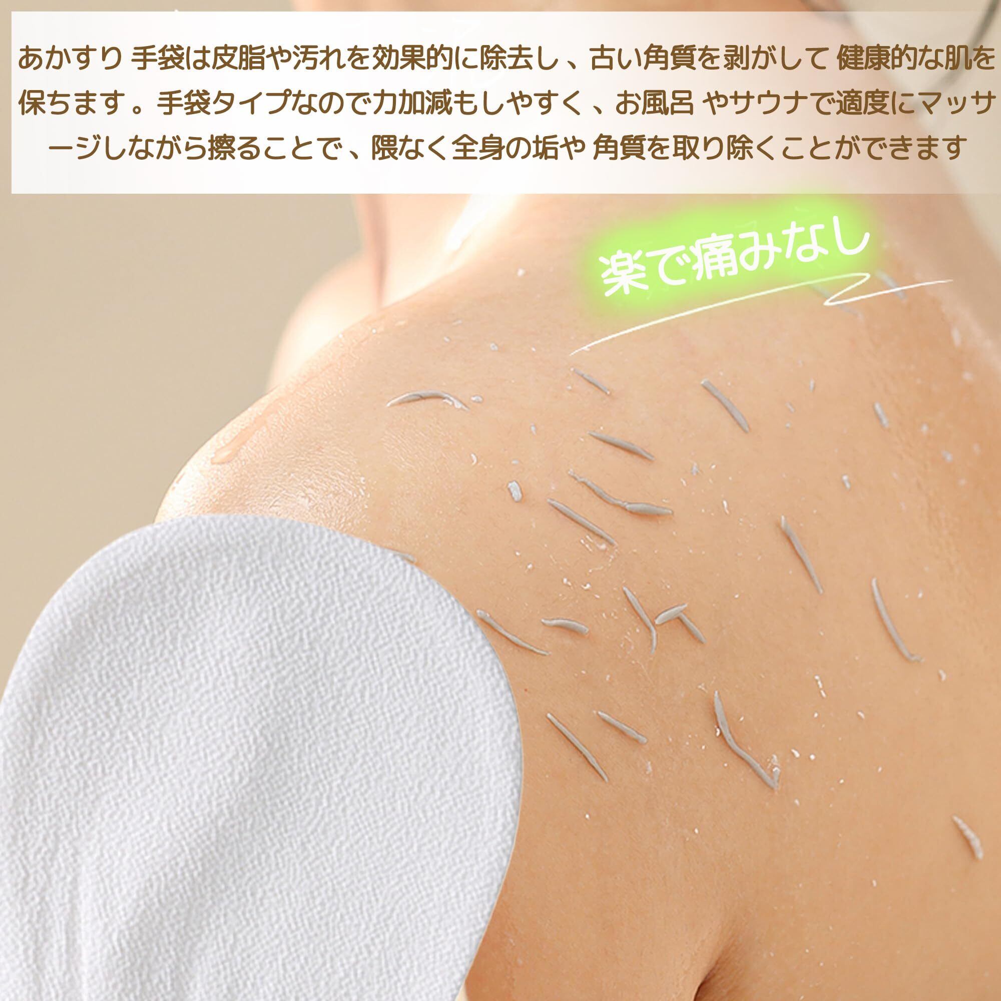 【フレキシブルサイズ】このアカスリ手袋のサイズは約15*20cmで、ほとんどの人に対応します。伸縮性のあるリストバンドは手首から滑り落ちないようにしっかりとフィットし、左右どちらの手でも使えます。男女兼用で、繰り返し使用可能です。2枚入り(白・黒)