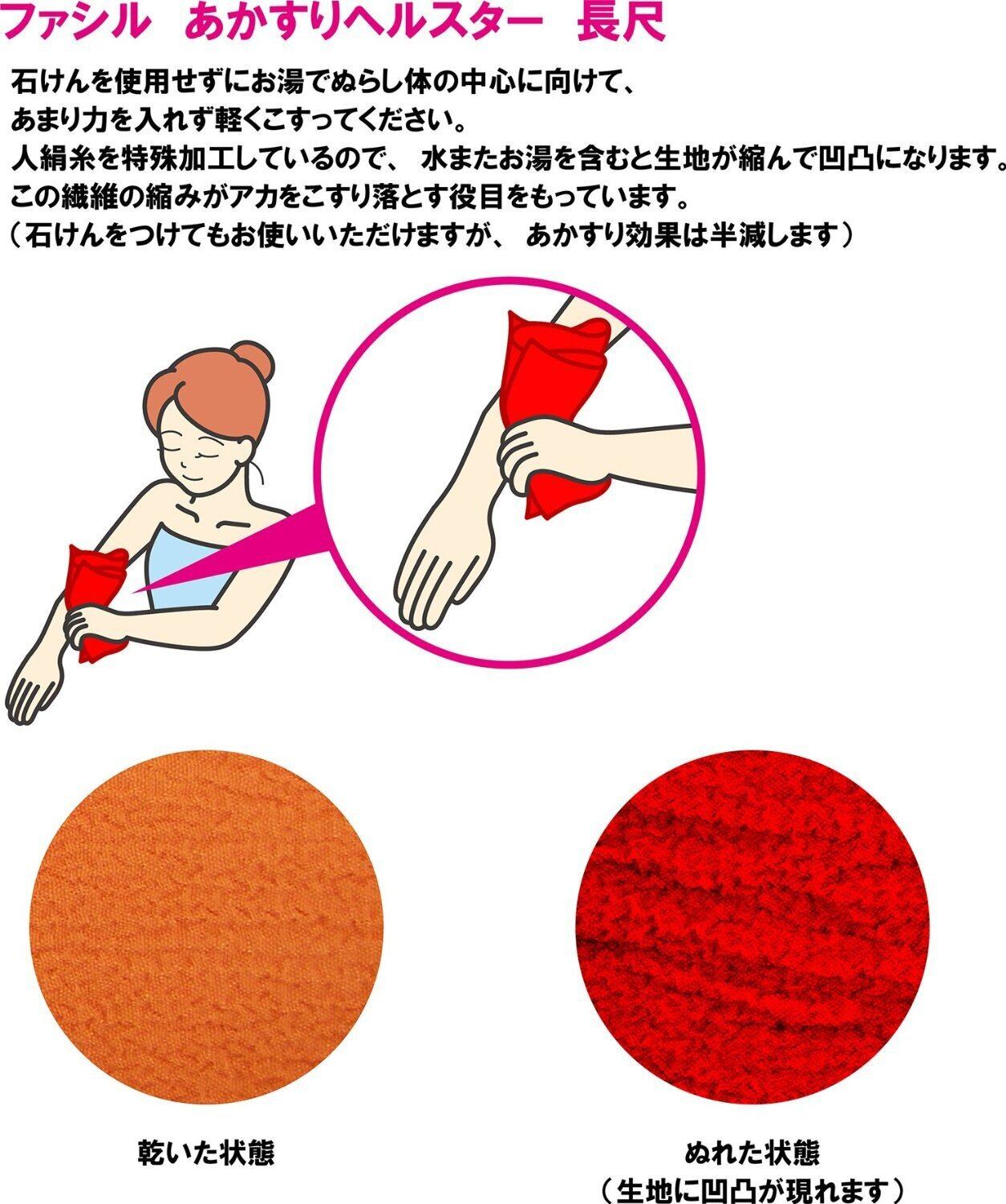 人絹糸を加工したあかすりタオルです。水またはお湯につけると繊維が縮み、アカをこすり落とす役目を果たします。 古くなった角質取りに効果的です。