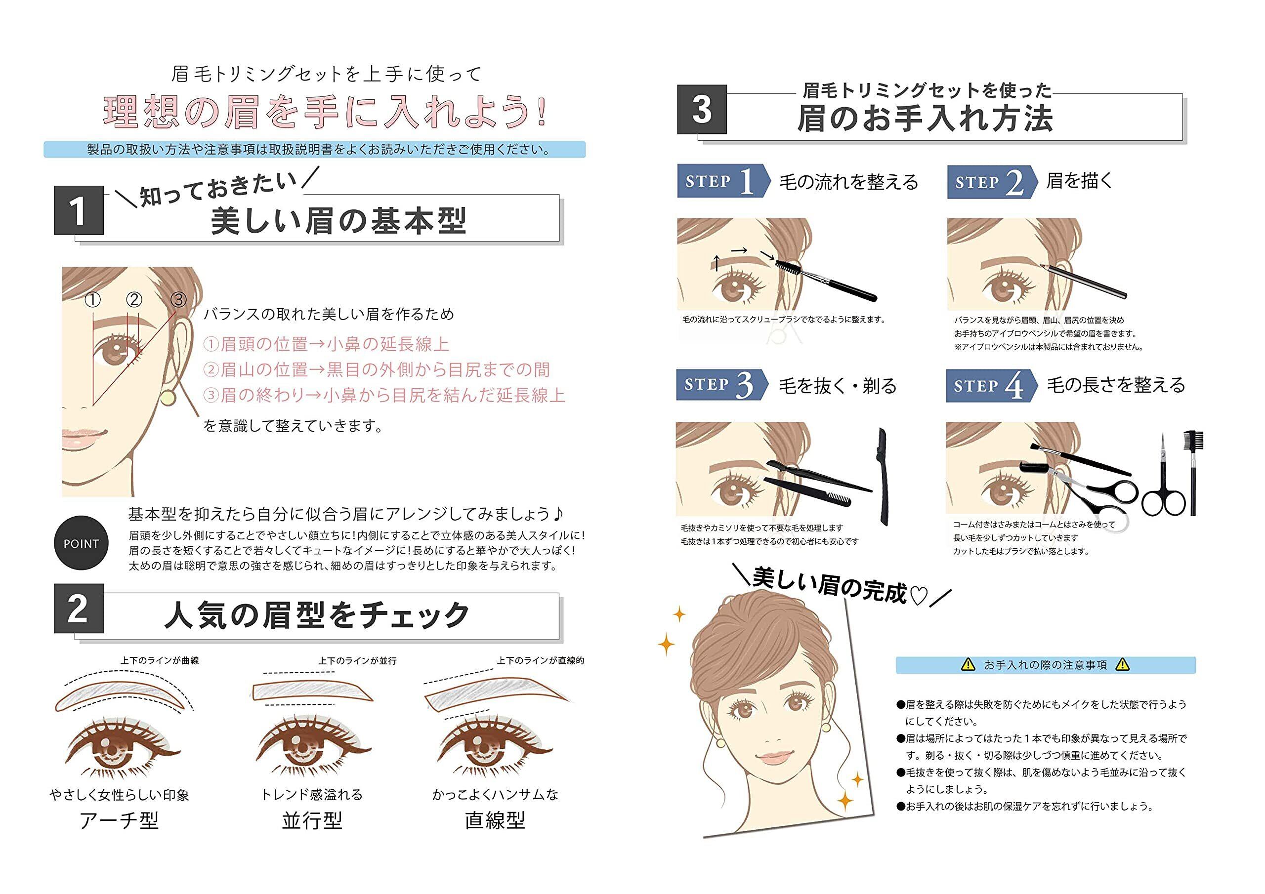 【こだわりのポイント】 ・毛抜きはがっちりホールドできるよう斜めにカット ・カットした細かい毛が顔についてしまうイライラ解消に柔らかい毛払い用ブラシもセット ・切れすぎを防止するために少し固めの設定 ・はさみはカットされる毛が見えやすいようにシルバーに変更 ・ 男女問わず、肌の弱い方や普段使いで頻繁に眉剃りや顔そりをする方に、少しでも負担を かけないようなフェイスカミソリを選定 ・理想の眉が見つかるガイド付き(かわいいイラストの日本語説明書)