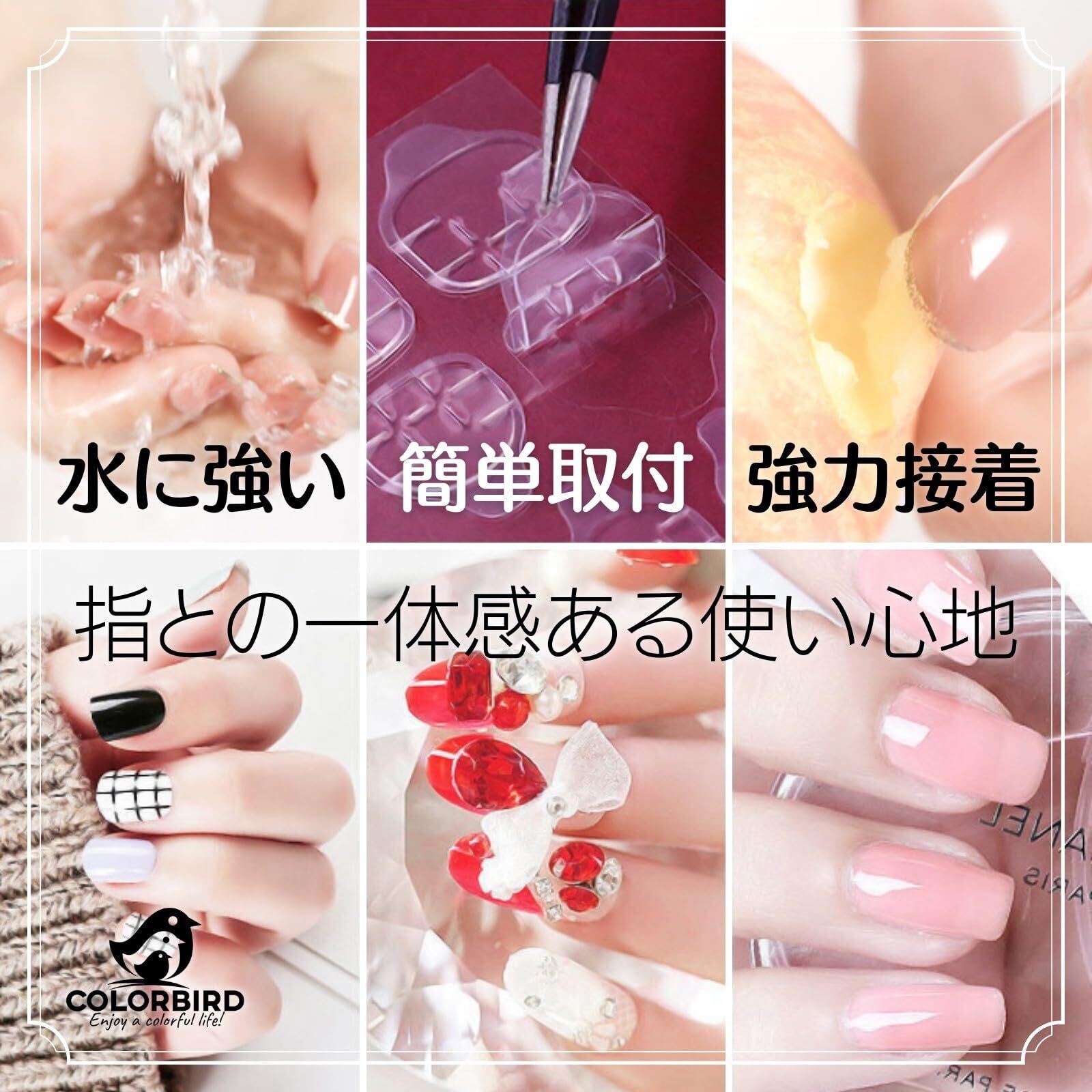【爪に優しい、安全な選択】両面テープは爪に優しいです。グルーを使用すると爪に負担がかかりやすく、取り外す際に爪が傷ついてしまうことがありますが、両面テープならその心配はありません。健康な爪を保ちながら、おしゃれを楽しむことができます。