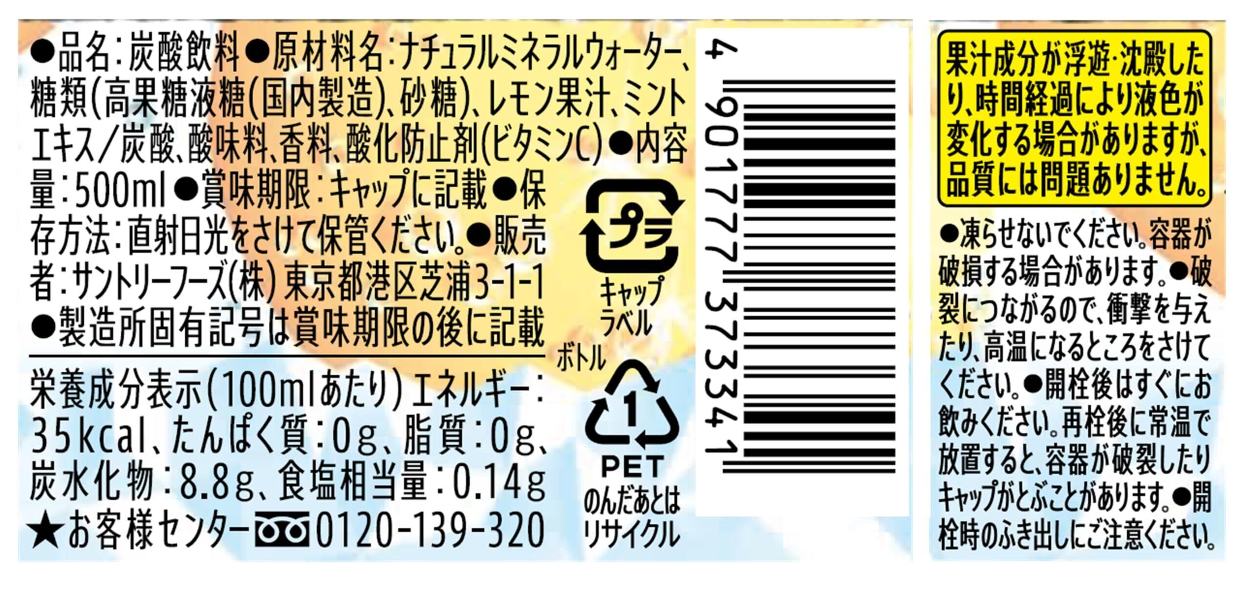 ナチュラルミネラルウォーター、糖類(高果糖液糖(国内製造)、砂糖)、レモン果汁、ミントエキス/炭酸、酸味料、香料、酸化防止剤(ビタミンC)