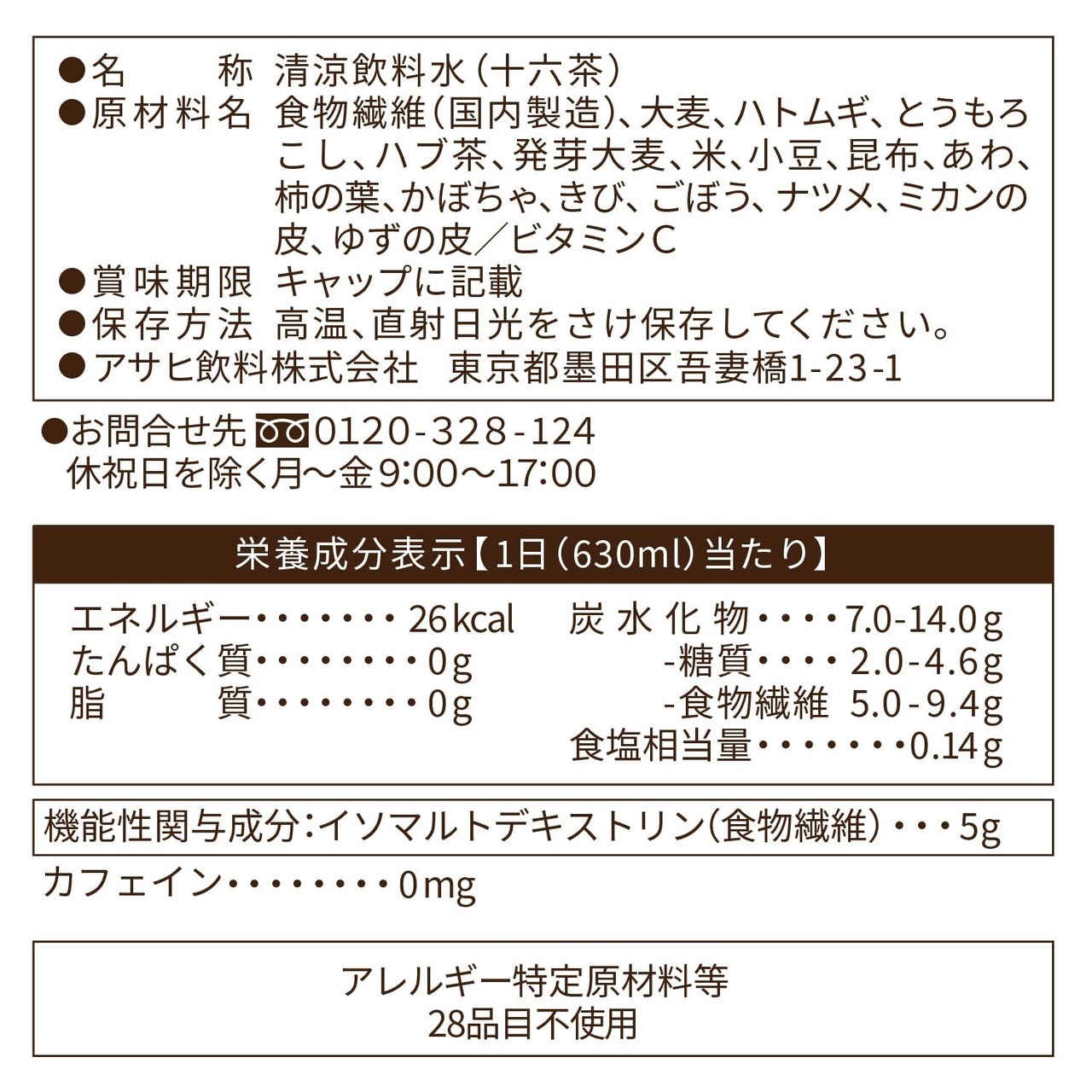 栄養成分表示【1日(1本:630mL)当たり】:エネルギー26kcal,たんぱく質0g,脂質0g,炭水化物7.0-14.0g ‐糖質2.0-4.6g ‐食物繊維5.0-9.4g,食塩相当量0.14g,機能性関与成分:イソマルトデキストリン(食物繊維)5g,カフェイン0mg