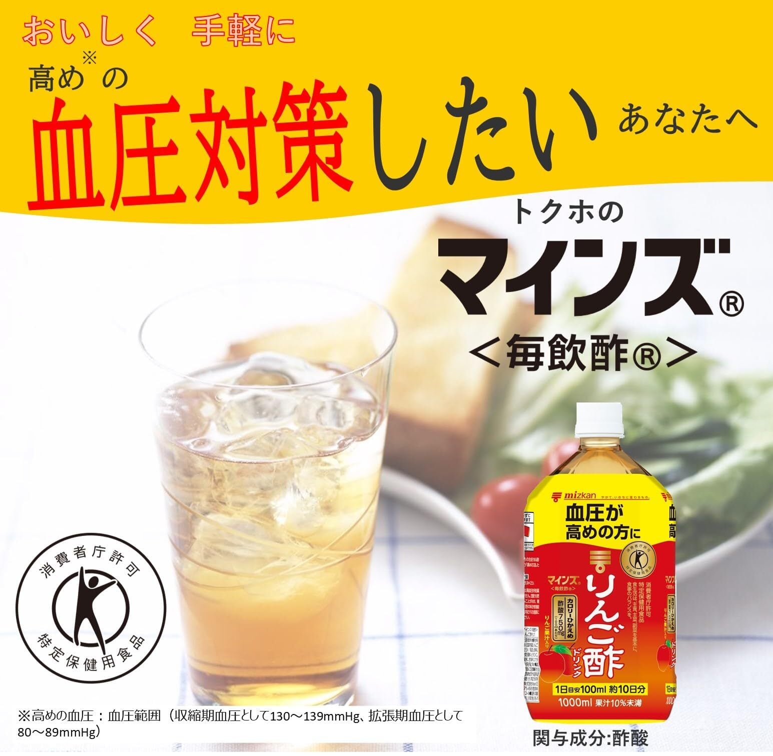 血圧が高めの方のための、特定保健用食品(トクホ)のリンゴ酢ドリンク(飲むお酢・飲む酢・お酢ドリンク)です。1日分100mlで、食酢の主成分である酢酸750mgをお摂り頂けます。そのまま飲めるストレートタイプのりんご酢ドリンクで、カロリー控えめです。許可表示:本品は食酢の主成分である酢酸を含んでおり、血圧が高めの方に適した食品です。