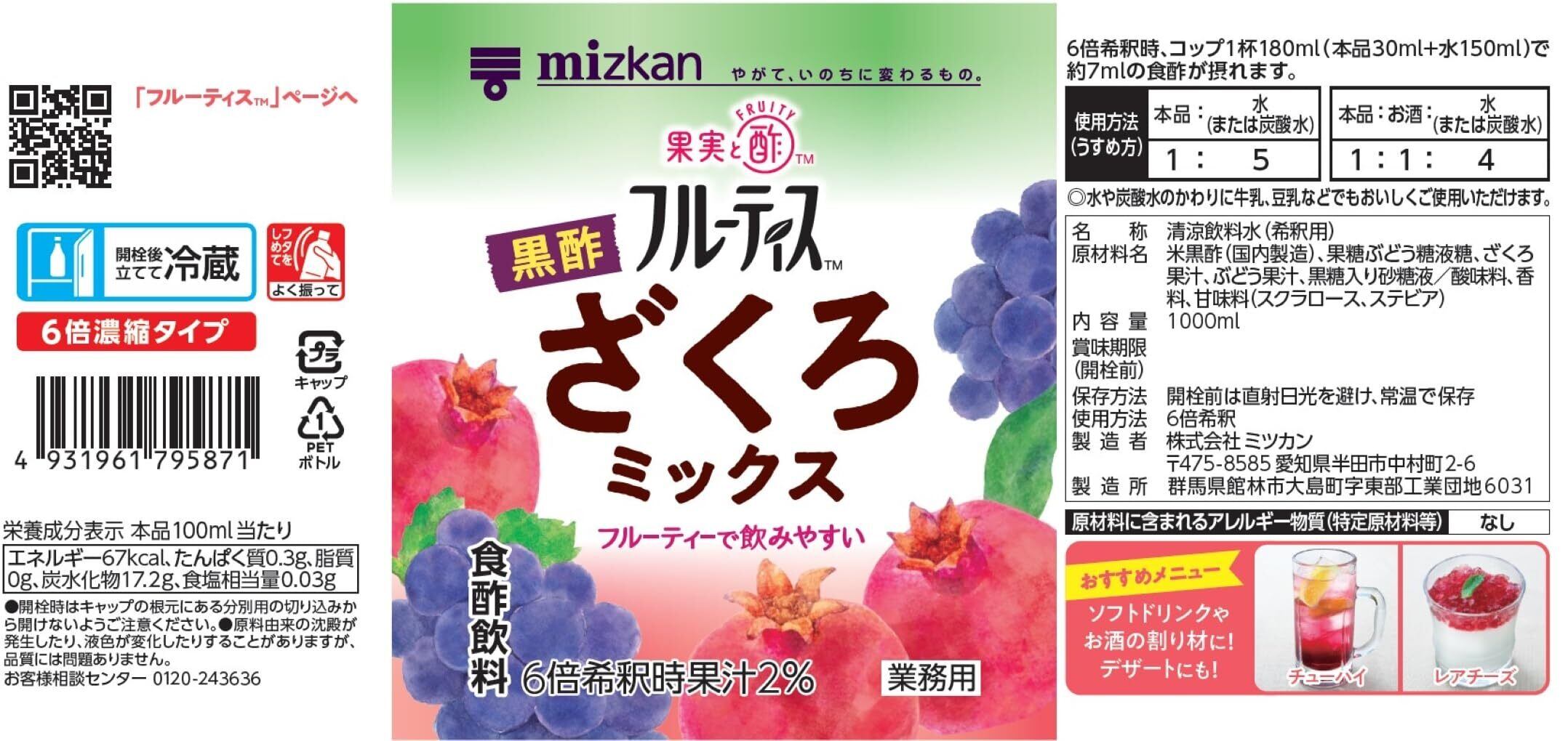 米黒酢(国内製造)、果糖ぶどう糖液糖、ざくろ果汁、ぶどう果汁、黒糖入り砂糖液/酸味料、香料、甘味料(スクラロース、ステビア)