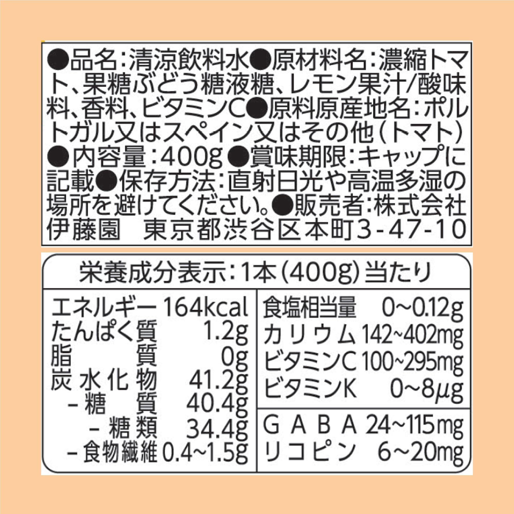 栄養成分(1本(400g)当たり):エネルギー:164kcal、たんぱく質:1.2g、脂質:0g、炭水化物:41.2g(糖質:40.4g(糖類:34.4g)、食物繊維:0.4~1.5g)、食塩相当量:0~0.12g、カリウム:142~402mg、ビタミンC:100~295mg、ビタミンK:0~8μg、GABA:24~115mg、リコピン:6~20mg