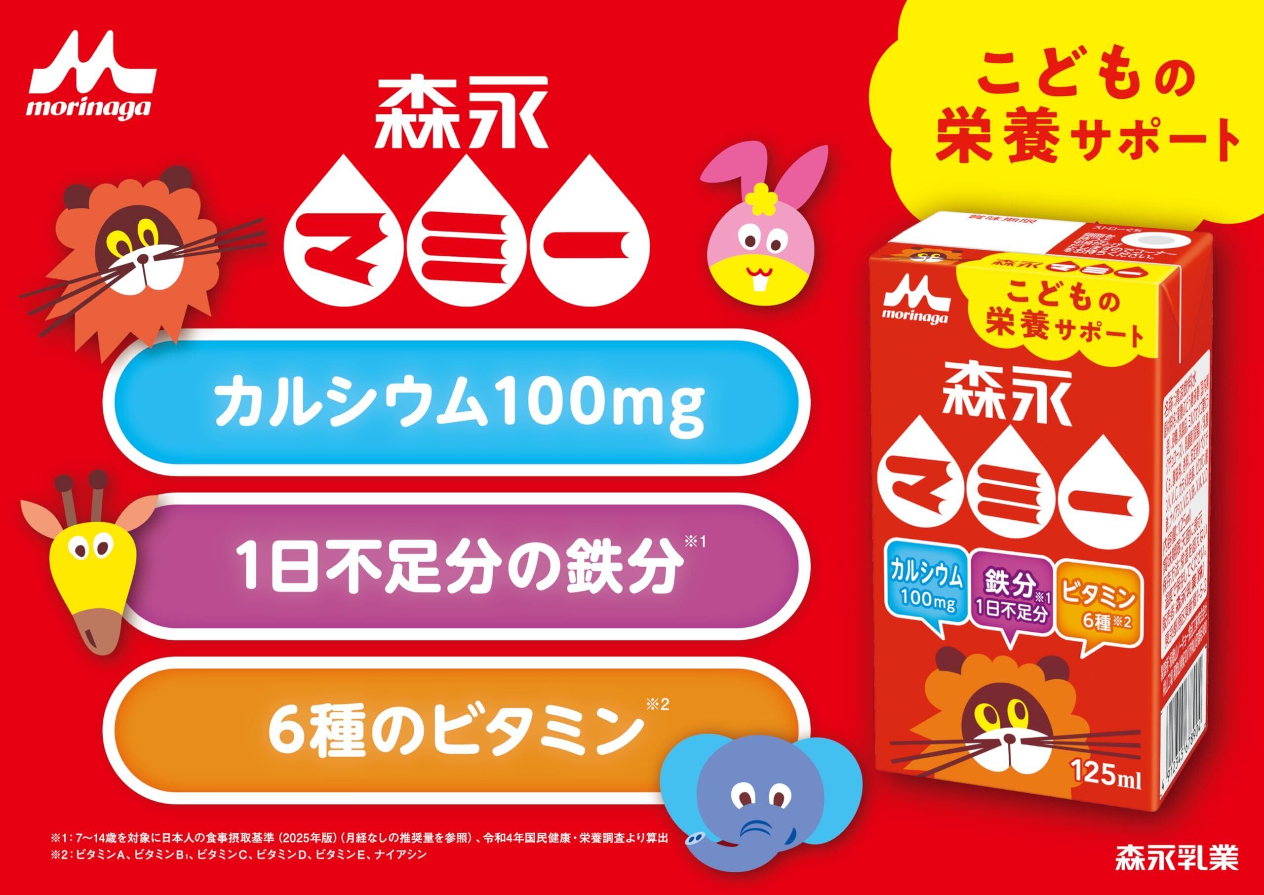 森永マミーのおいしさはそのままに、成長期の子供に欠かせない栄養素(カルシウム・鉄分・ビタミン6種※)を配合した飲料です。 ※ビタミンA、ビタミンB1、ビタミンC、ビタミンD、ビタミンE、ナイアシン