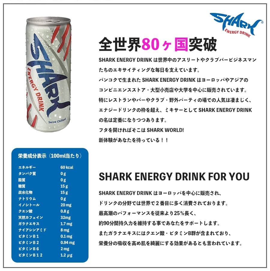 タイ原産でありながら、東南アジア諸国はもちろん、ヨーロッパでも大人気となっているシャークエナジードリンク! すっきりとした甘さに喉越しのイイ微炭酸がたまらない! 含まれるガラナエキスとクエン酸、そして5種類のビタミンB群の栄養素たちがあなたのパフォーマンスをより長く引き出すサポートをします! 商品1本あたりのカフェイン含有量は80mgと従来のエナジードリンクと比べて半分以下なのでカフェインを気にされている方も安心してお召し上がりいただけます。