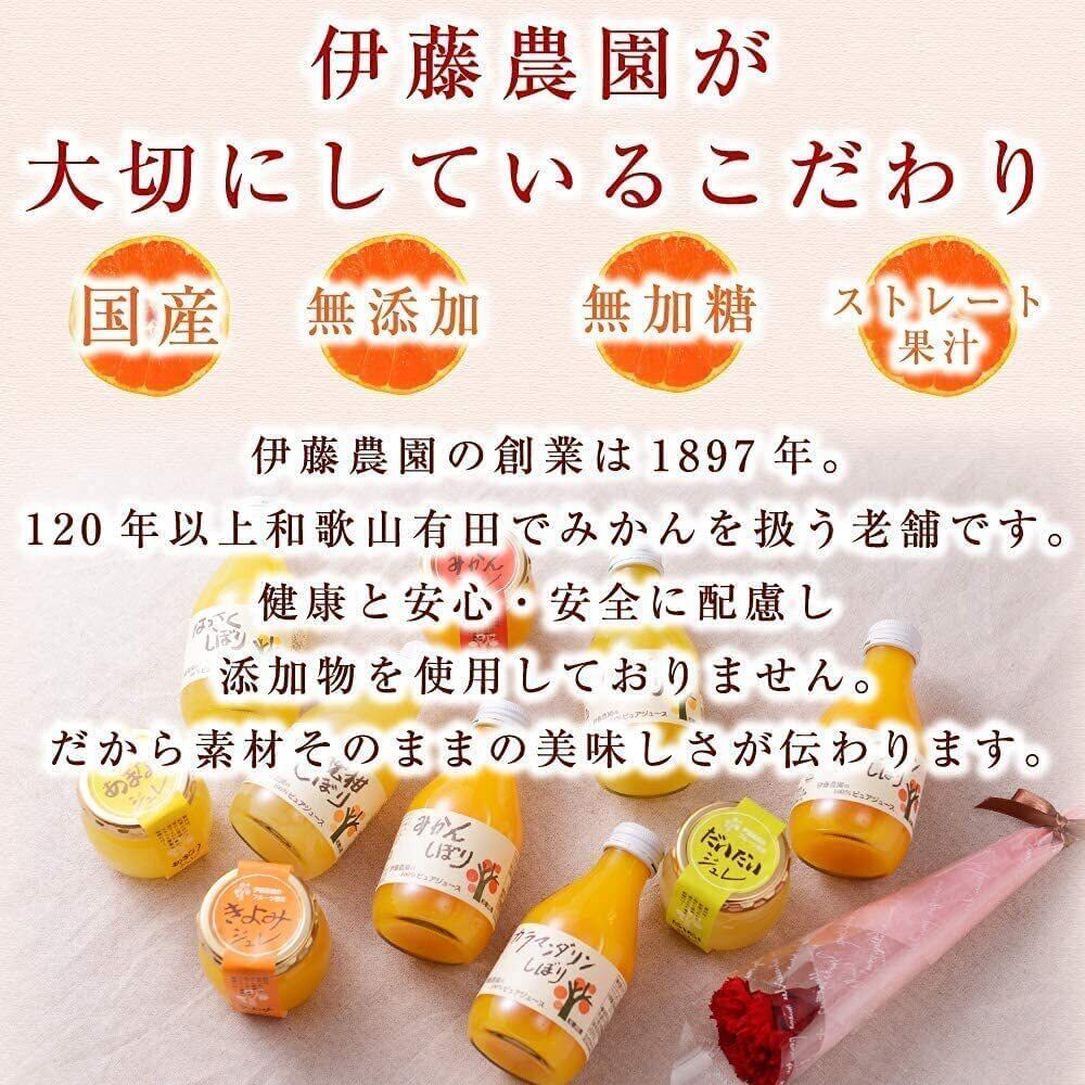 原料はすべて「和歌山県産」 有田川流域で400年の歴史をもつ「有田みかん」。 伊藤農園は1897年創業。100年以上もみかんの故郷である和歌山「有田」でみかんを扱ってきました。 当農園の果実は南に面した段々畑で、太陽の恵みと黒潮から吹く潮風、有機肥料で育ちます。紀州の温暖な気候が、ジューシーなみかんを育んでいるのです。