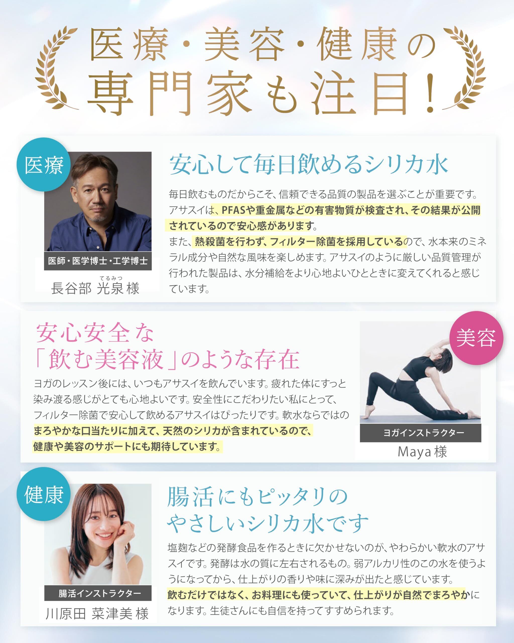 【医療の専門家も注目】「医師・医学博士・工学博士」「ハーバード大学客員教授」の長谷部光泉先生のコメント「毎日の水分補給にシリカ水を取り入れるのは、健康や美容に気を配る方には適した選択肢です。アサスイはPFASや重金属などの有害物質が検査され、その結果が公開されているので安心感があります。」