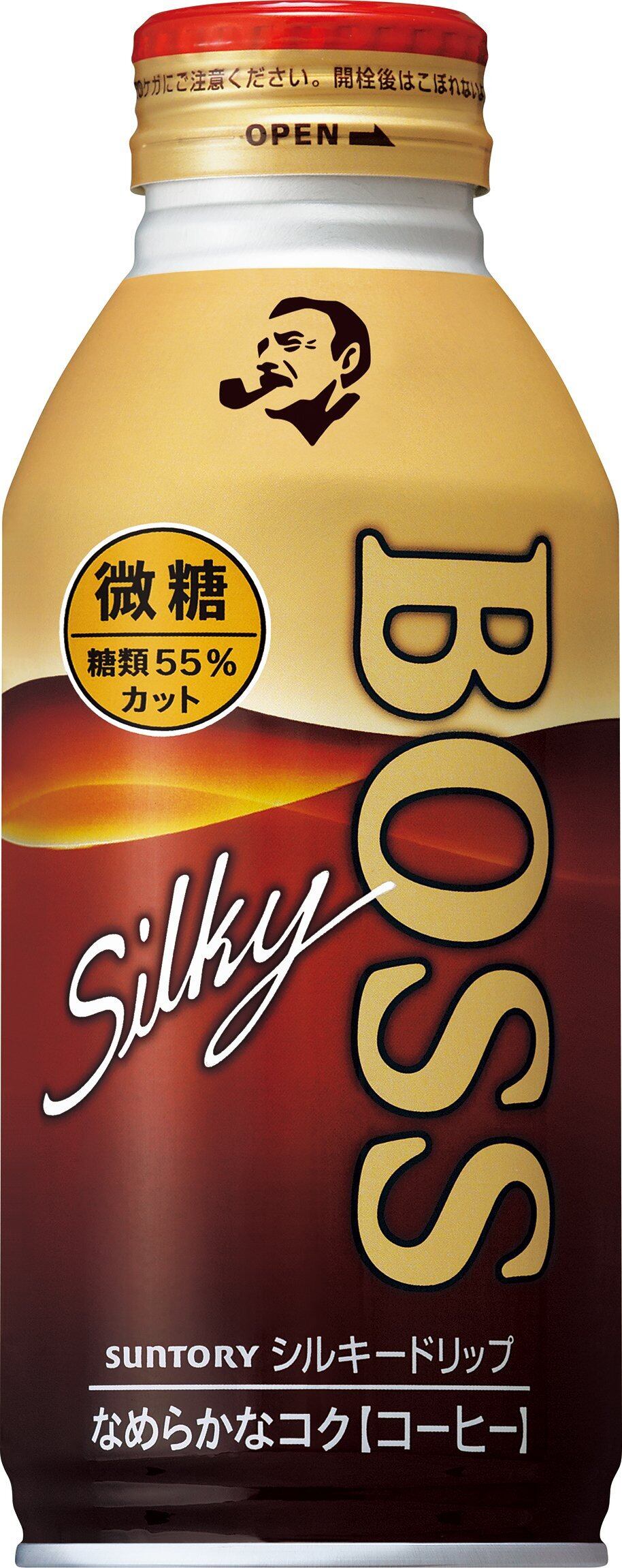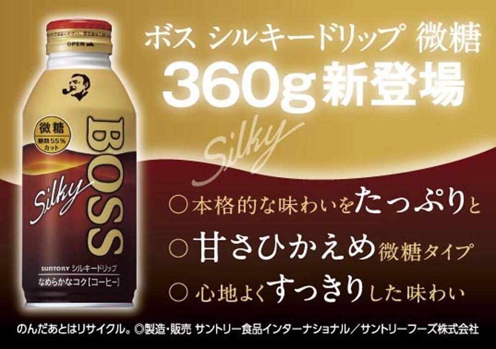 ボスシルキードリップ微糖より、360gの増量ボトル缶新発売! ホットコールド兼用です。コクと香ばしい香りを引き出すじっくり長時間焙煎と「シルキードリップ製法」による雑味がなくなめらかなコーヒーです。甘さ控えめの微糖タイプに仕上げてありますので、コクを感じつつもすっきりした味わいになっております。
