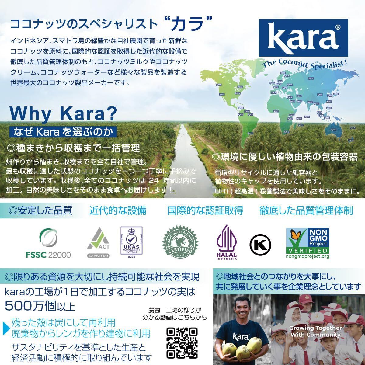 karaは、近代的な設備と国際的な認証を取得し徹底した品質管理体制で安心。インドネシア、スマトラ島の緑豊かな自社農園で収穫された新鮮なココナッツを原料様々なココナッツ製品を製造する世界最大のココナッツ製品メーカーです。
