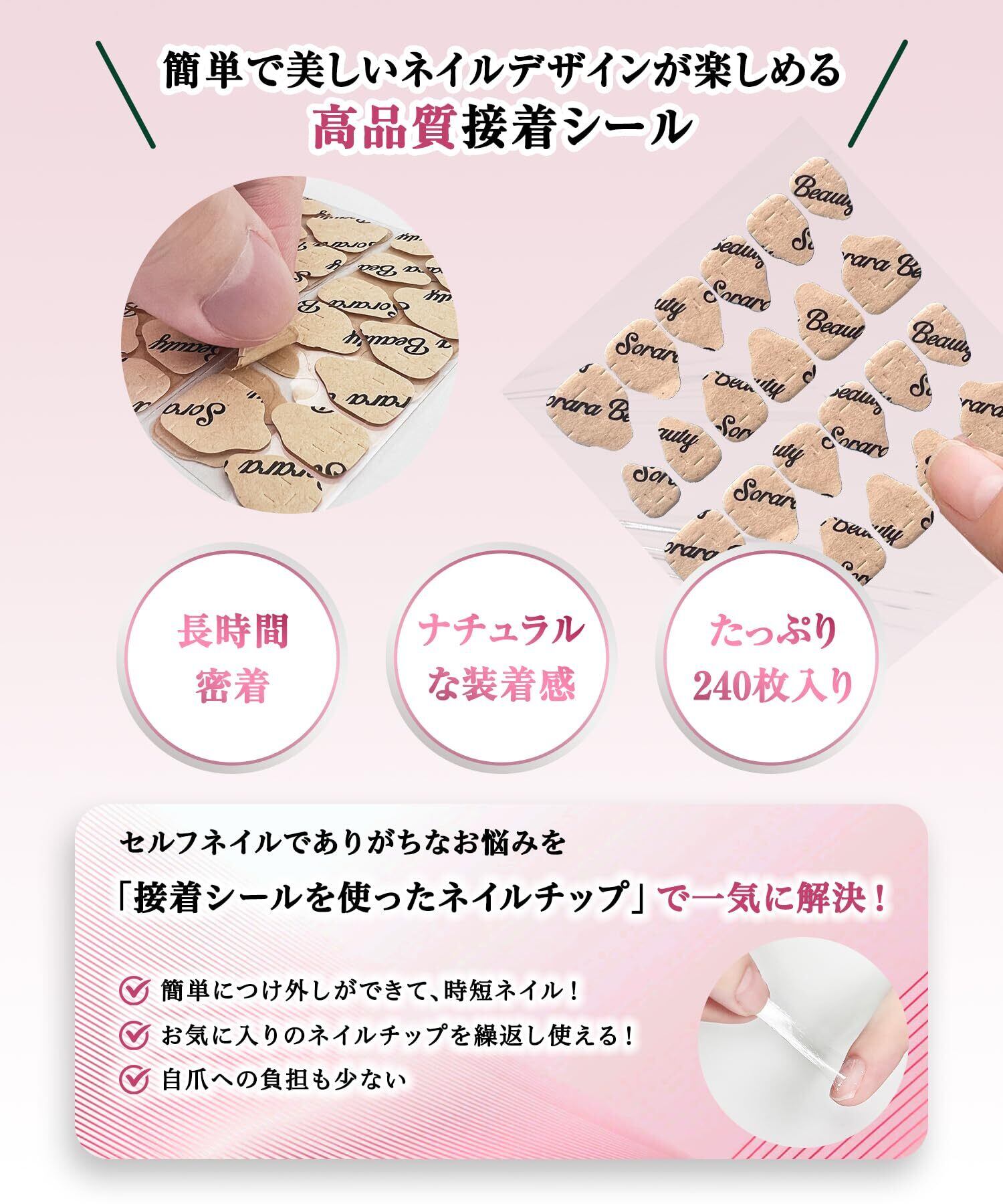 【在庫セール】【現役ネイリスト監修】SoraraBeauty 超強力 ネイルチップ専用接着シール 付け爪 つけ爪 両面テープ ネイル つけづめ 爪用 接着剤 テープ グルー 0.3mm 極薄 透明 防水 通常サイズ ピンク (ピンク, 240枚入) | Lumisfera