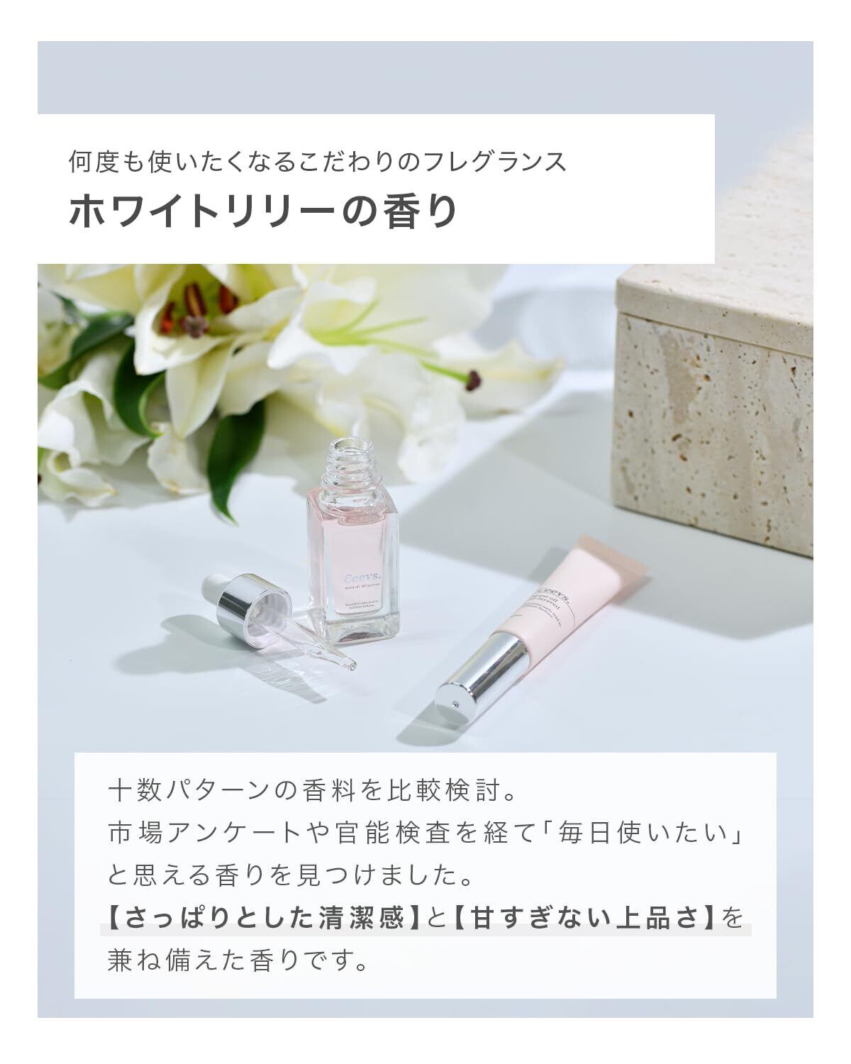 3種類の植物オイル(アルガンオイル,ホホバオイル,バオバブオイル)で爪先を潤し、ホワイトリリーの上品な香りが広がります。