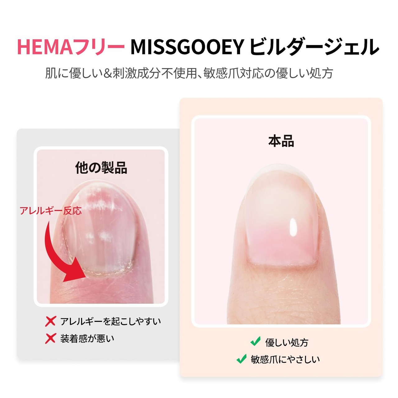 【MISSGOOEY 多機能ビルダージェル】:オーバーレイ(厚み出し)、ハイポイント形成、長さ出し、フォルム整形など、これひとつでマルチ対応。複数アイテムを揃える手間を省き、自宅で手軽にサロン品質の仕上がりを実現します。