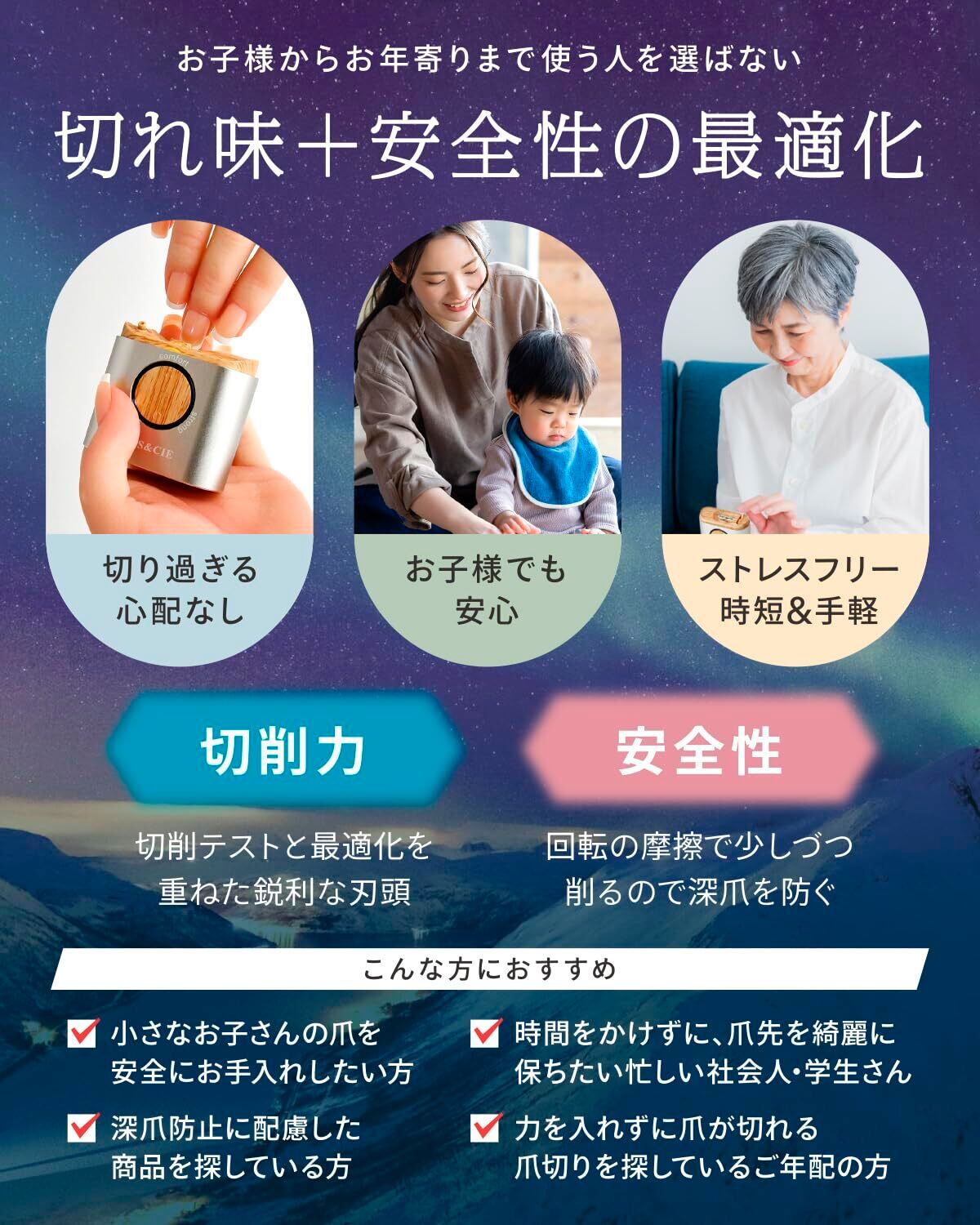 【Poco'ce掲載】 電動爪切り 爪削り Type-C充電式 静音 刃2段階 高齢者向け 日本メーカー 北欧デザイン 日本語サポート
