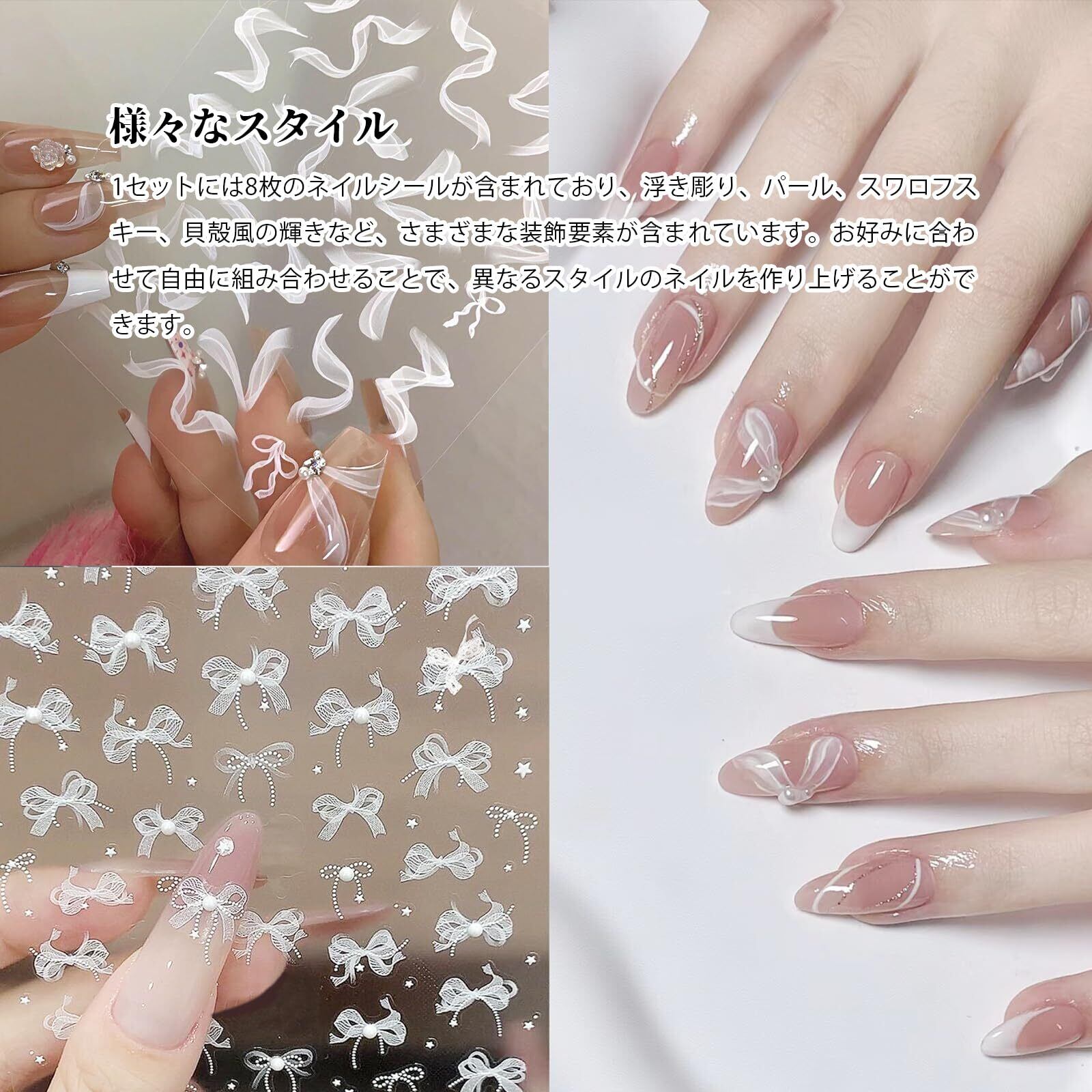 【様々なスタイル】1セットには8枚のネイルシールが含まれており、浮き彫り、パール、スワロフスキー、貝殻風の輝きなど、さまざまな装飾要素が含まれています。お好みに合わせて自由に組み合わせることで、異なるスタイルのネイルを作り上げることができます。