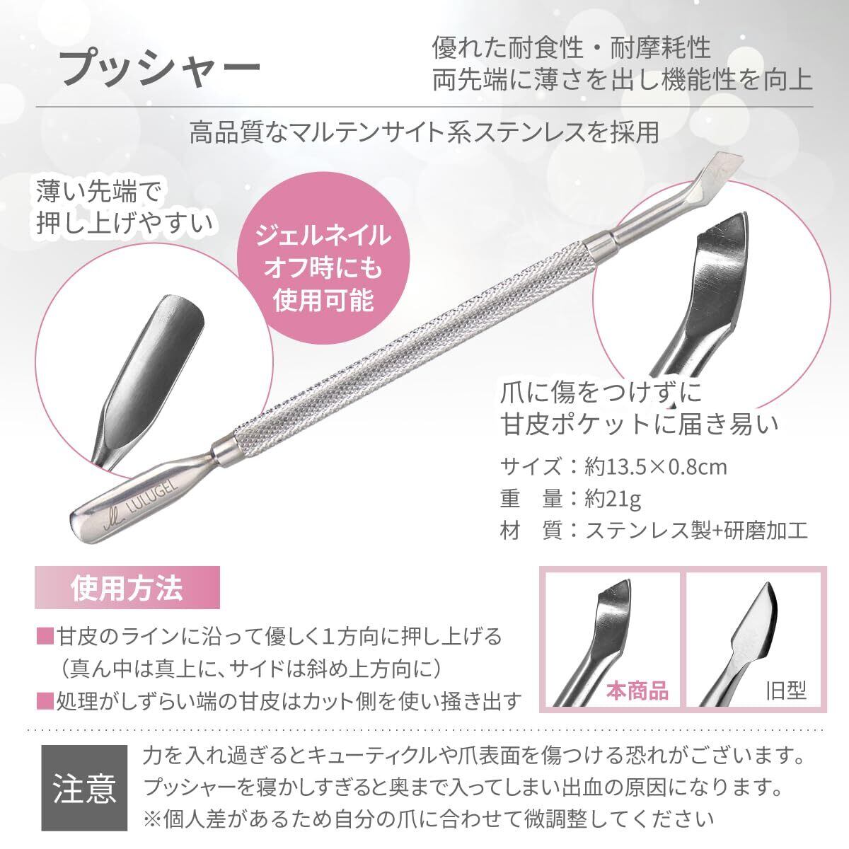 【キューティクルプッシャー】多くのネイリスト達の要望を叶えた形状となっており、かきだす、はぎとる、穿り出す、押し上げるなどの動作が繊細にできる特徴を持つネイル プッシャーです。キューティクルリムーバー(cuticle remover)を使わなくても極薄な構造になっているため甘皮を容易に押し上げることができる甘皮 プッシャーです。ネイル 甘皮処理、プッシャー ネイルはLULUGELにお任せください。
