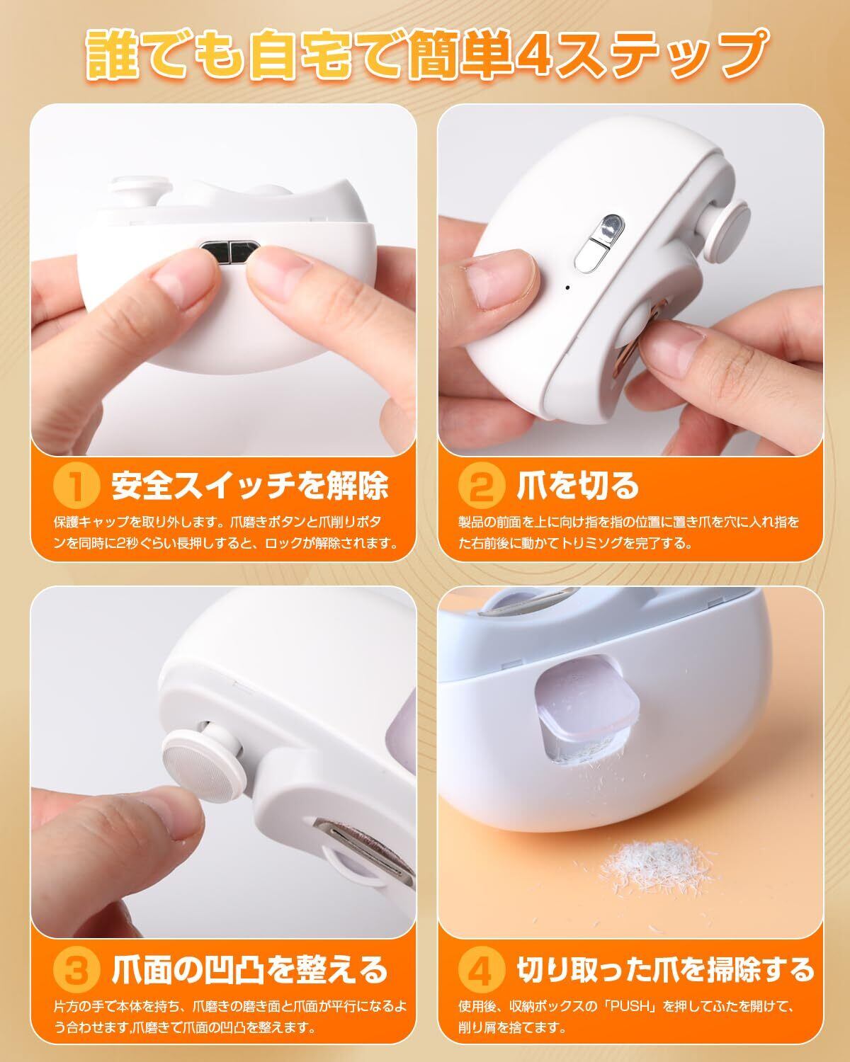 電動つめきりは爪切りと爪磨きがこの1台でできる!爪削り機能で爪を整えて爪磨き機能で爪を滑らかに.爪磨き面を爪の表面に平行に当てることでつるつるピカピカに保つことができます。高品質合金で作られた螺旋状の刃、電源を入れるとが45°で高速回転し、アップグレードモーターと防護バー技術の組み合わせ、指を傷つける心配なく簡単に爪をきれいにすることができます。