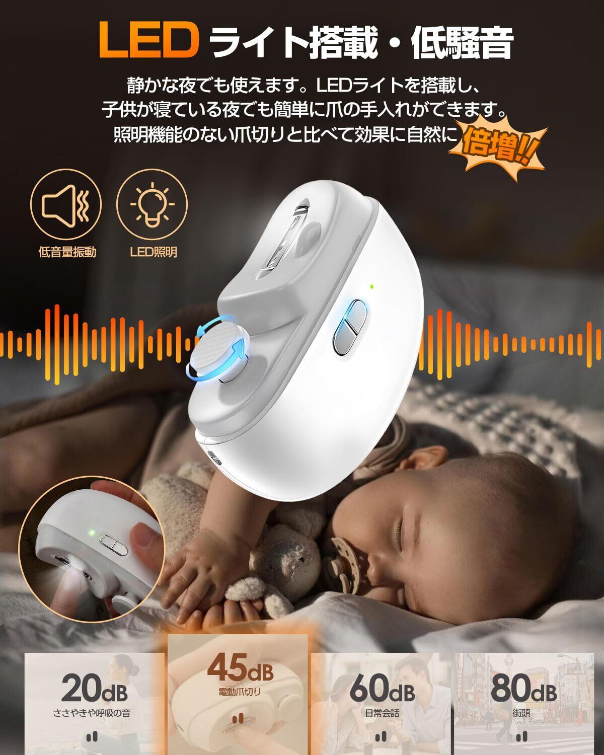【ライト点灯&静穏設計】 低振動モーターでとても静かなので、使い心地がよく、寝ている赤ちゃんを起こす心配もありません。また、ヘッド付近にはLEDライトが付いており、暗い場所でも指先を照らし、爪の長さを補正してくれるので安心です。電源をつけると自動でライト点灯!暗い場所や手元が影になる場面で大活躍。製品の駆動音はたったの40dBなので寝ている赤ちゃんを起こさずに使用することができます。