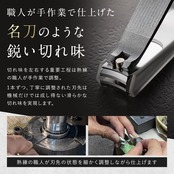 【手業で創り上げた逸品】刃物の命である熱処理にこだわり、先代から技術を受け継いだ職人の手で一つ一つ心を込めて丁寧に仕上げております。切れ味をどこまでも追求しており、刃の焼き入れを突き詰め硬度の高さをギリギリまで上げ、切れ味に個体差が出ぬよう職人が手間暇をかけ研ぎ。組み立てについても手業で行っております。硬くなった爪の方も驚く程軽い力で爪を切ることが可能です。やすりも必要ない程に切り口が滑らかに切れます。心地よい切れ味を味わってお楽しみ下さい。