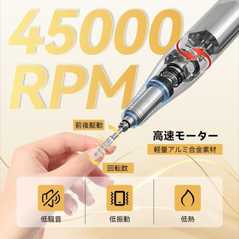 【高品質&低騒音&USB充電】: ネイルマシン高速モーターを搭載し、静音で低騒音の研磨が可能です。ハンドルには放熱孔があり、自動放熱機能で手が熱くなりにくいです。内蔵の2000mAhバッテリーで様々な場面で使用でき、USB充電に対応しており、TYPE-C充電ケーブルは99%の充電機器に対応しており、便利で安全です。(注意:初回充電前には、まず本体を起動してから充電してください。起動していない状態では、充電ができない場合があります。)