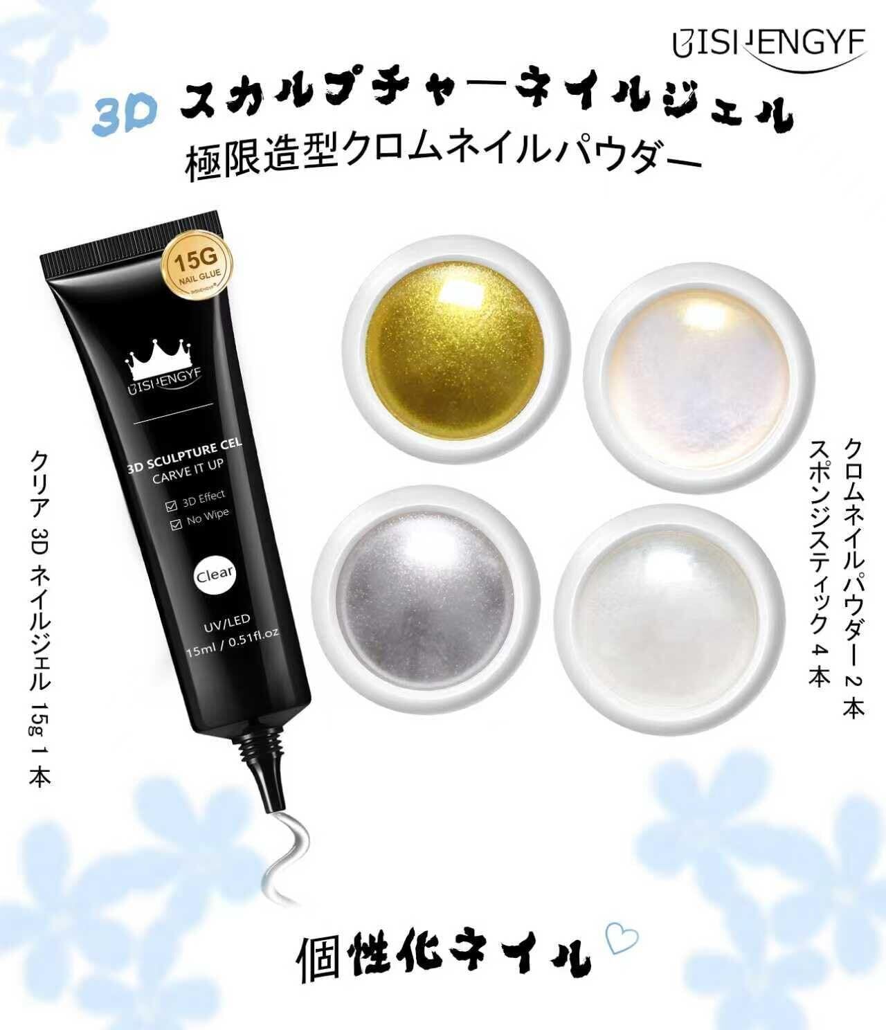 BISHENGYF 3Dキット:このキットにはミラーパウダー 4個、15g クリアジェル 1 個、アイシャドースティック 2 個が含まれています。家庭でのネイルアートやサロンでの業務に最適です