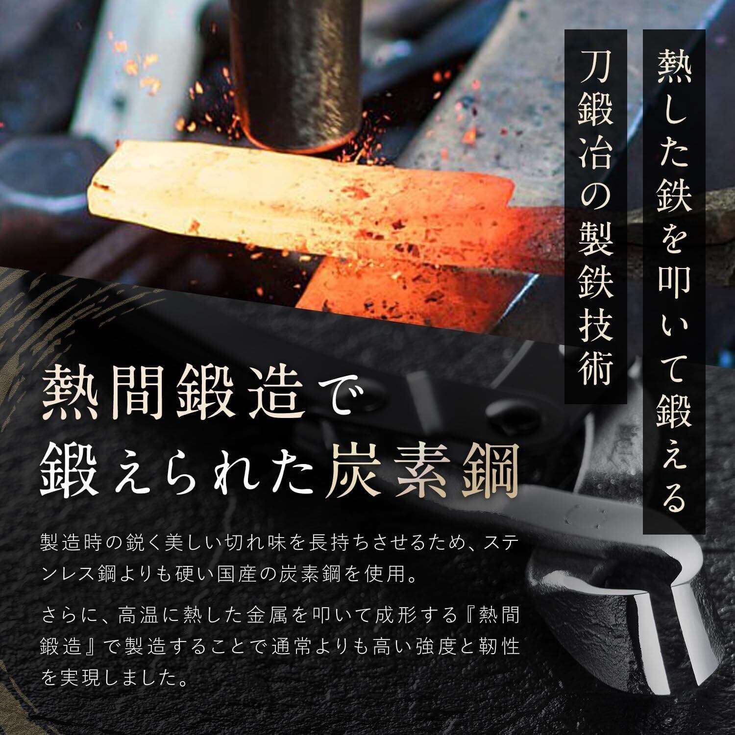 【◆素材にもこだわり、重量の軽減】刃部本体は長期間の切れ味維持が出来るように、ステンレス鋼のような柔らかい素材は使わずに、神戸製鉄の国産鋼を使用。炭素鋼ハイカーボンS58Cで製作しています。成形は丸棒から叩き出す熱間鍛造で成形しており、刃付けと仕上げは、熟練した技を保つ職人の腕で仕上げています。柄の材料はSPCC材を使用し。変形防止のU字曲げを施して軽量化を実現しました。