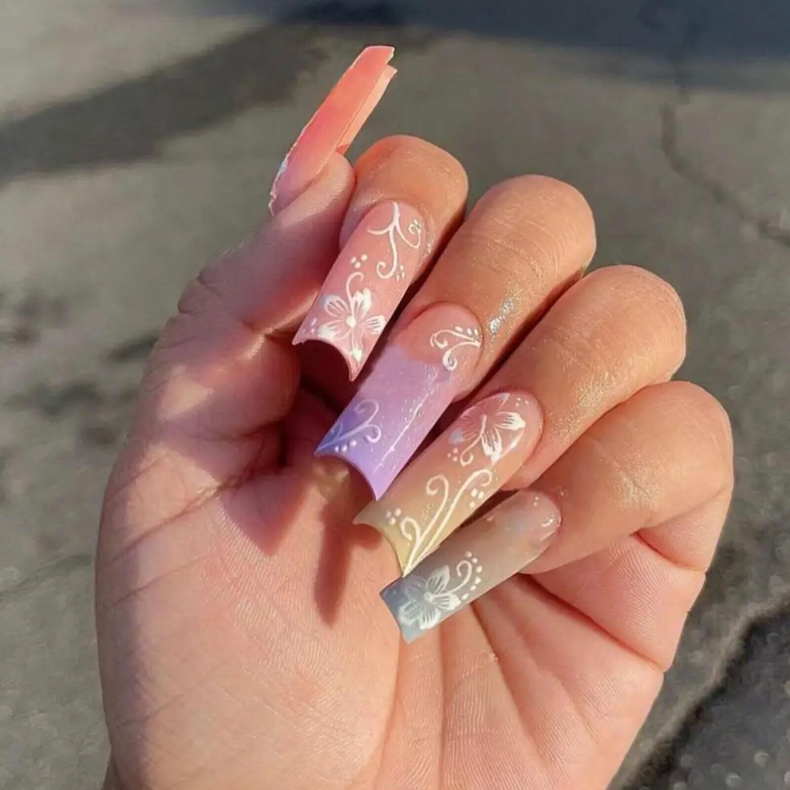 【かわいいデザイン】ミックスカラー、ホワイト、ピンク、ゴールド、シルバーなど、さまざまな色のハイビスカスの花がとても繊細で美しくネイルにあしらわれています。