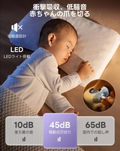 【静音設計&LEDライト搭載】この電動爪削りは静音性に優れたモーターを搭載しており、使い心地がよいです。赤ちゃんが静かに寝ている夜に使用しても、赤ちゃんを起こす心配はありません。また、爪の先端を照らすLEDライト付きで手元をよく照らせるため、安全に細かい作業ができます。