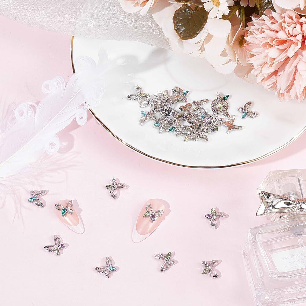 バタフライラインストーンネイルチャーム:バタフライネイルチャームは光沢があり愛らしいです。中空ネイルチャームはアクリルネイルや指の爪に適しています。爪に装飾を加えるのに最適です. 金属の基本色はシルバーです, カラフルなラインストーンが埋め込まれたペア, キラキラと美しい.