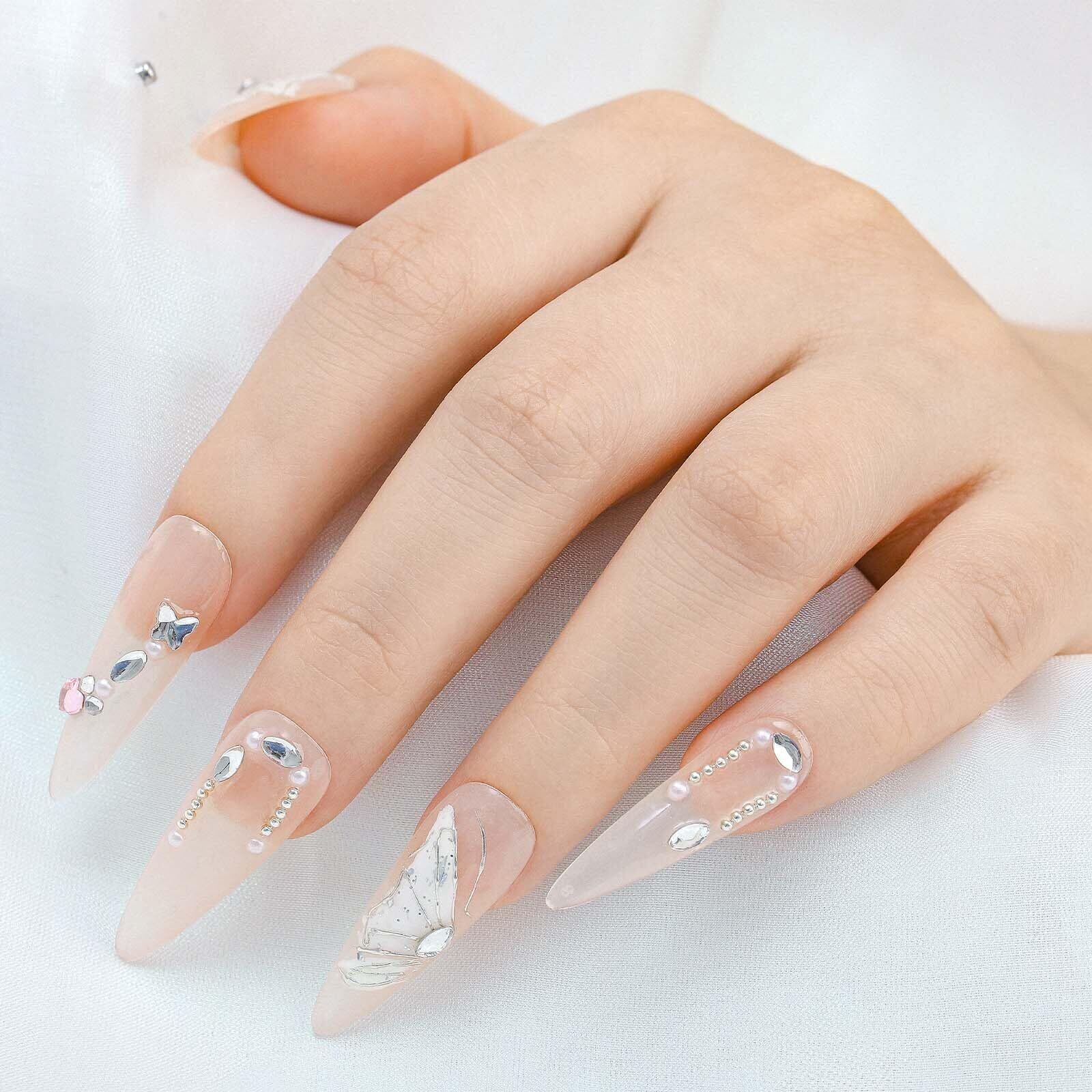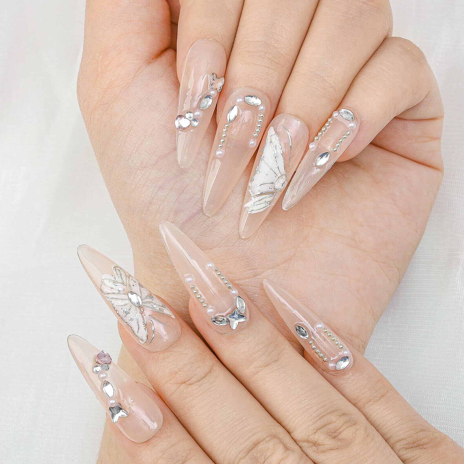 【在庫処分】Sethexy 手作りネイルチップ ベリーロングアーモンドチップ 光沢 蝶々 プレスオンネイル 立体レリーフ つけ爪 ラインストーン 3D爪 ロング クリスタル 付け爪 フェイクネイル おしゃれ 小さい爪用 セルフネイル かわいい 韓国ネイルアート 10枚入り 卵形 ホワイト | Lumisfera