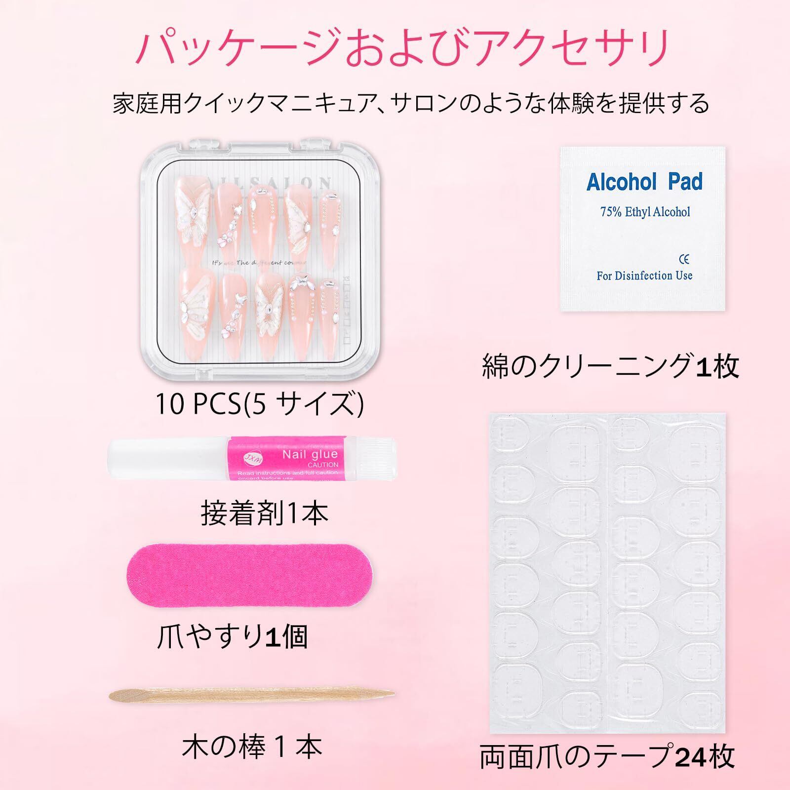 パッケージ:10個の手作りネイルには梱包箱が付属しており、その中には両面爪のテープ24枚、爪やすり1個、綿のクリーニング1枚、木の棒1本、ネイル接着剤1本が含まれています。