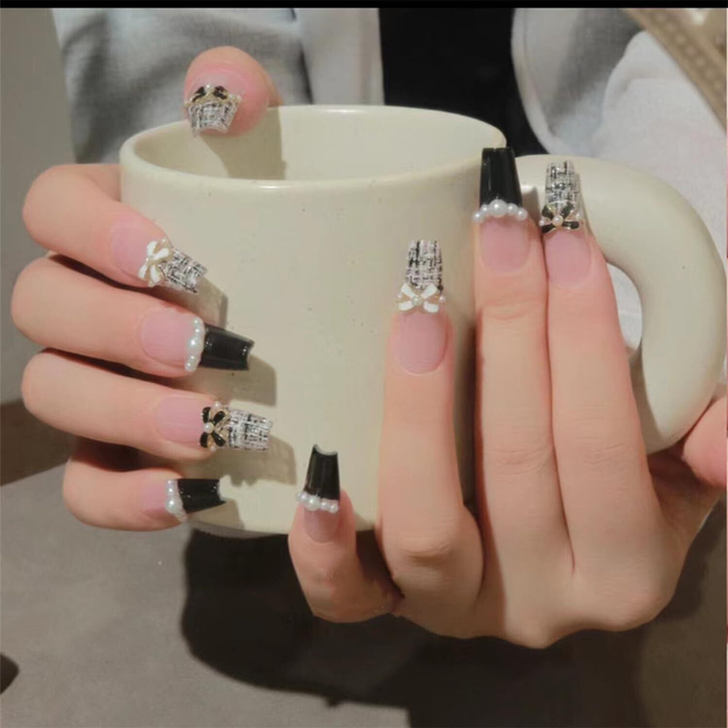 【新春セール】XUZOO ネイルチップ 付け爪 3D おしゃれ 人気 立体ネイルチップ 花嫁ネイルチップ 結婚式 つけ爪 ジェルネイルシール 可愛い 長め 短め 手用のネイルチップ ネイルツール 両面テープ付き 24枚 (ブラック, 12サイズ) | Lumisfera