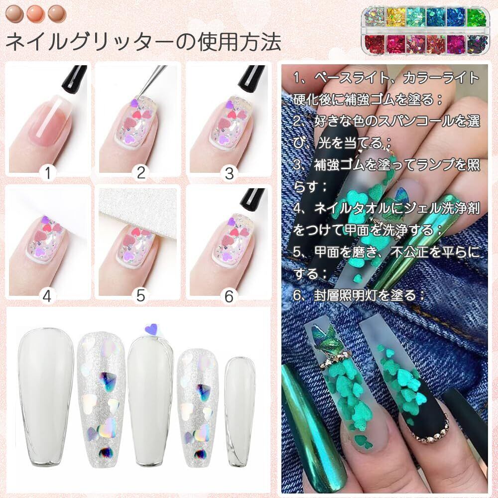 セット内容:ネイルグリッター2箱セット;ハート型のグリッターは12色;3mm/4mmの2種類の大きさのハート柄が、あなたのネイルをキラキラとチャーミングに。 グリッターは12色あり、様々なニーズに合わせて自由に組み合わせることができます。