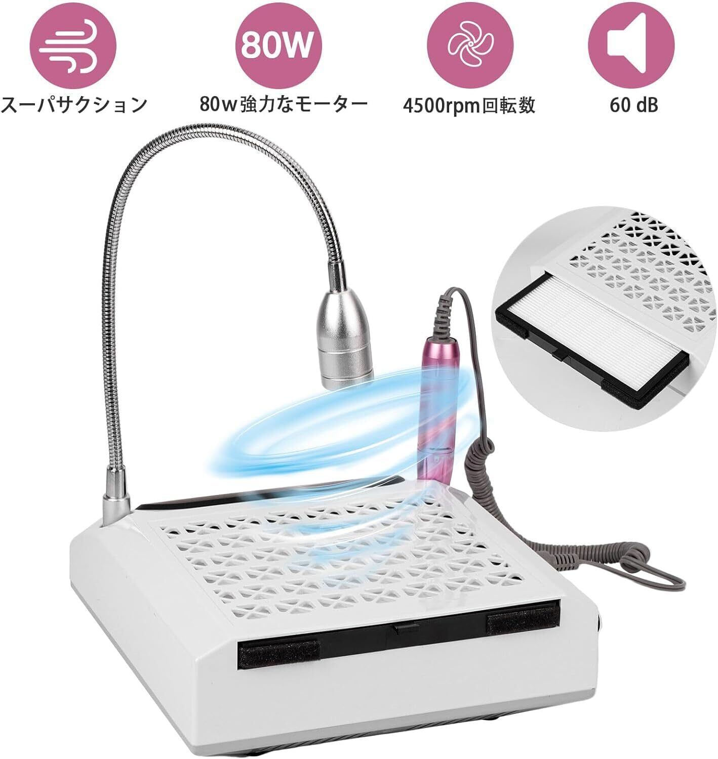 【強力な吸引力】80w強力なモーター、回転速度は調節できます、吸収面も広く、99%のネイルダストを除去でき、ほこりが吸い込まれる可能性が少なくなりました、体に良い!機器の運転時に発生する熱は正常な現象です。ただし、高温環境下でご使用いただくと過熱しやすくなりますので、その際は3~5分程度運転を停止し、放熱させてください。このような適切な対応が機器の寿命を延ばすことにつながります。