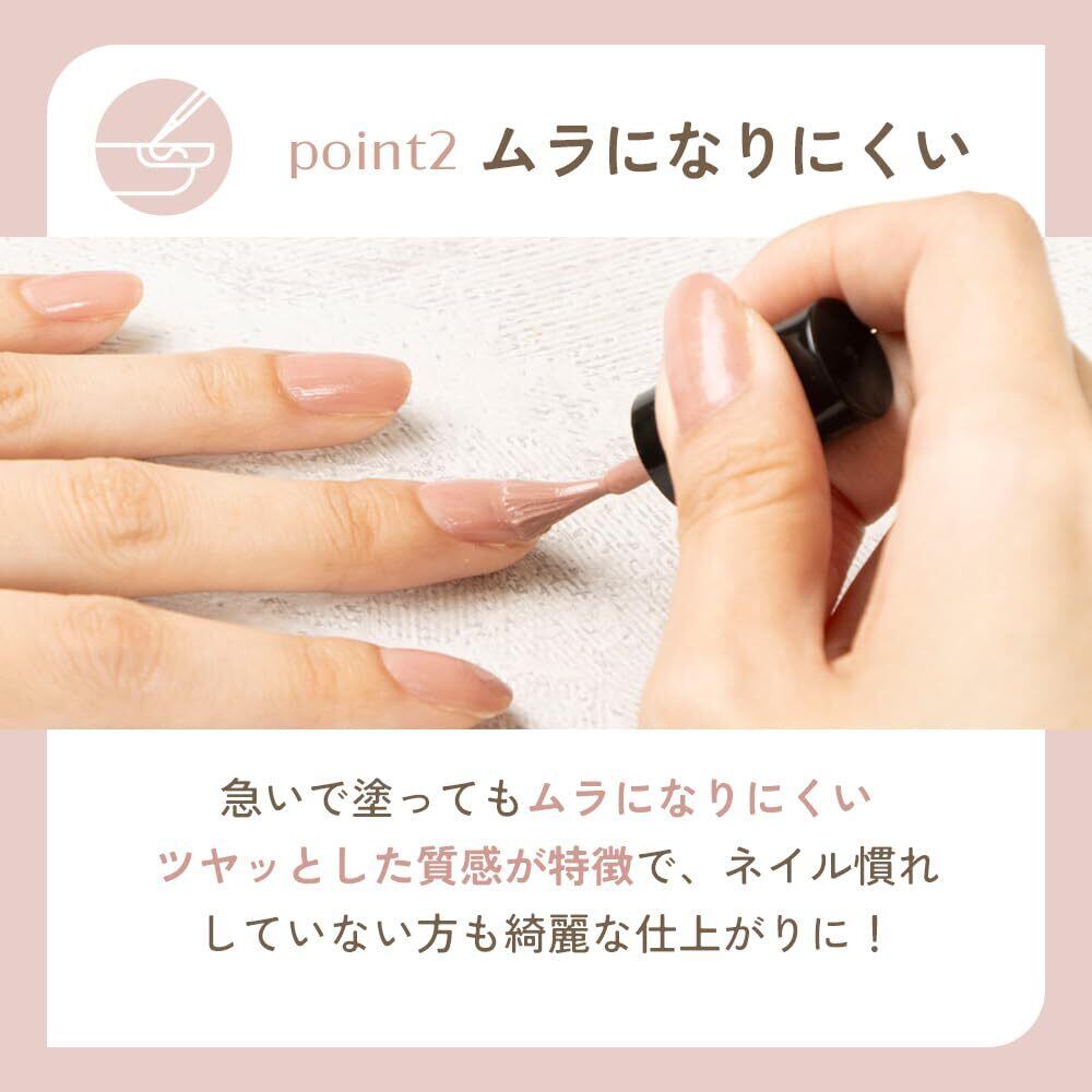 【使い方】爪に嬉しい成分を多数配合しているため、爪へ直接塗るのがおススメ!①爪の表面の油分や汚れをしっかり落とします※ハンドクリームやネイルオイルを塗った状態の爪に使用するとはがれやすくなります。しっかり油分を落としてから塗るのが長持ちのポイント!②ボトルの口で筆をしごき、片側だけに駅が残る量に調整します。③筆を立て、筆を押し広げた状態で爪先まで1回で塗ります。④乾いたらお好みの発色・厚さになるまで繰り返してください。※オフするときはリムーバーをご使用ください。