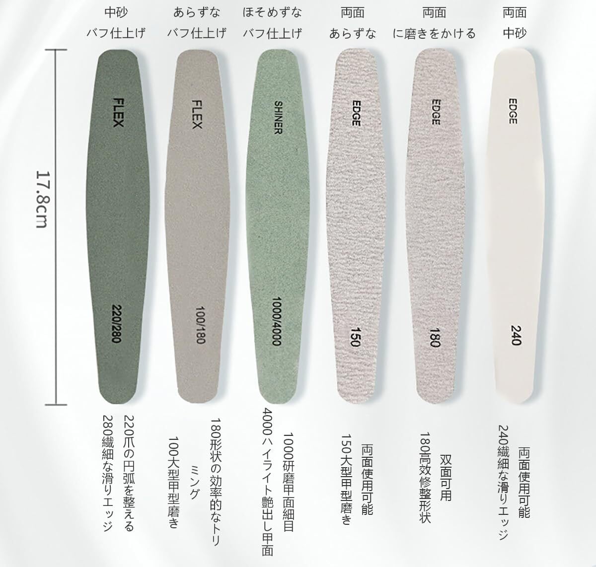 【爪やすりと爪磨きセット】セットには、150、180、240、100/180、200/280、1000/4000グリットのヤスリが含まれています。ジェルネイルの必需品である100/180グリットは、自爪や人工爪の表面を滑らかに整えます。1000/4000グリットは非常に細かいヤスリで、仕上げの段階で爪を輝かせるために使用します。