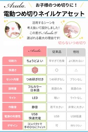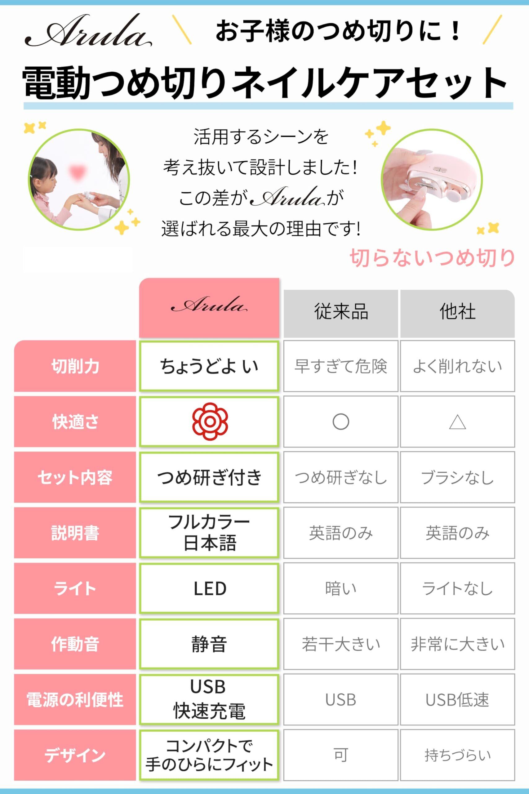 電動爪切り 電動爪研ぎ ネイルケアセット 爪切り つめ切り 2in1 爪とぎ ツメ切り ツメきり 爪研ぎ 爪ヤスリ 爪やすり クリスタルつめ研ぎ付き 飛び散らない パチンと言わない 極細に削る ネイルしたままok LEDライト よく見える 回転つめ研ぎピカピカ USB Type-C USB-C ブラシ 静音 軽量 チャイルドロック Arula (パステルパープル)
