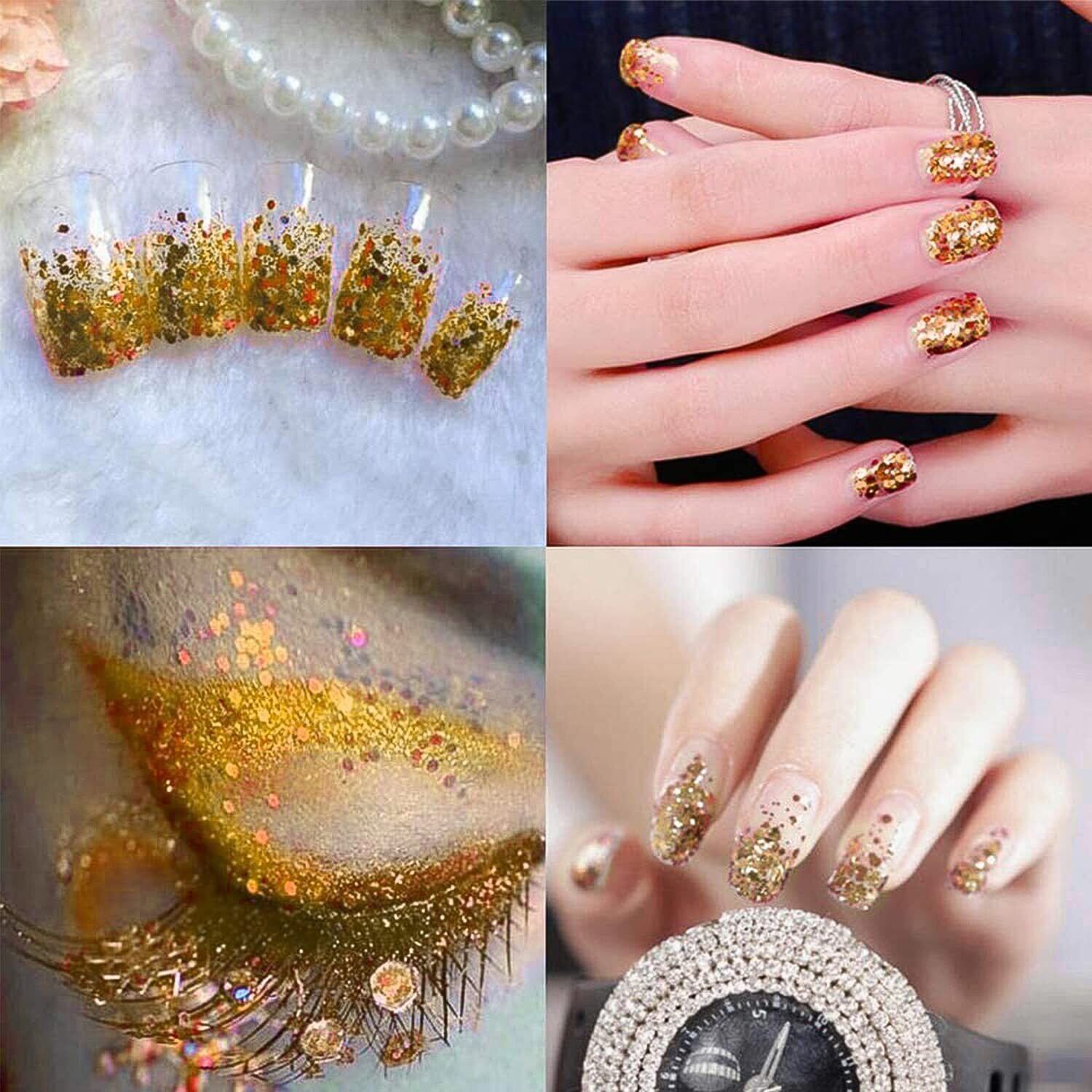 Coollooda グリッター 容器入り キラキラ ネイルパーツ ネイルアート ネイルタウン ラメグリッター ラメパウダー ヘア飾り 顔 ボディ クリスマス 新年 パーティー 5個セット (ゴールド セット1mm&パウダーミクスサイズ) (ゴールドシリーズ)