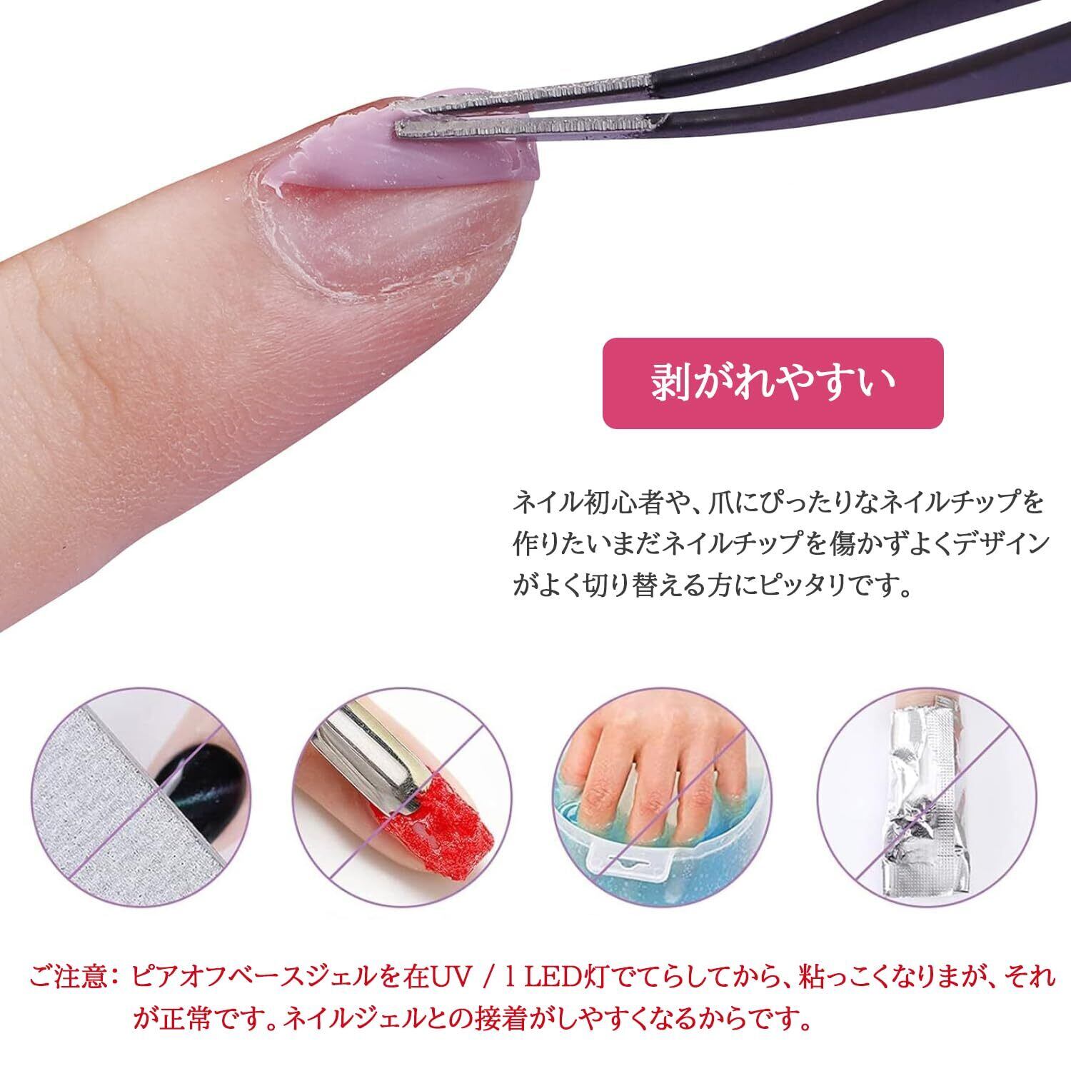 【ご注意】:ピアオフベースジェルを在UV / l LED灯でてらしてから、粘っこくなりまが、それが正常です。ネイルジェルとの接着がしやすくなるからです。それからをトップコート塗って、ネイルはサラサラになってきます。