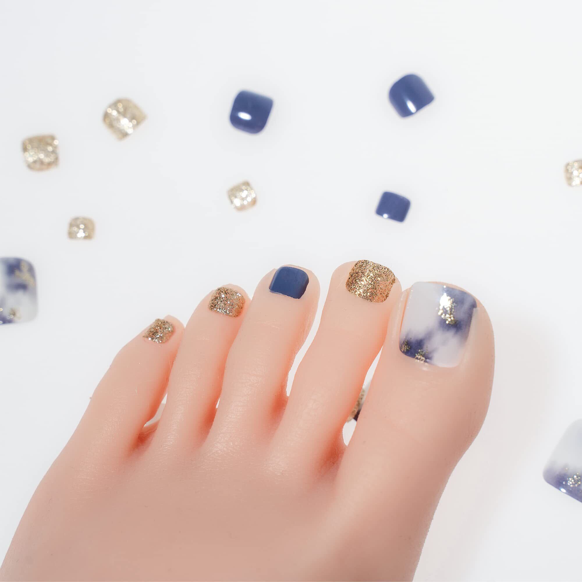 Sun&Beam Nails 足用 ネイルチップ グリッター フット ショート つけ爪 キラキラ かわいい 人気 おしゃれ 付け爪 ファッション 貼るだけ 長持ち 24枚入 (#1-青と白の石模様)