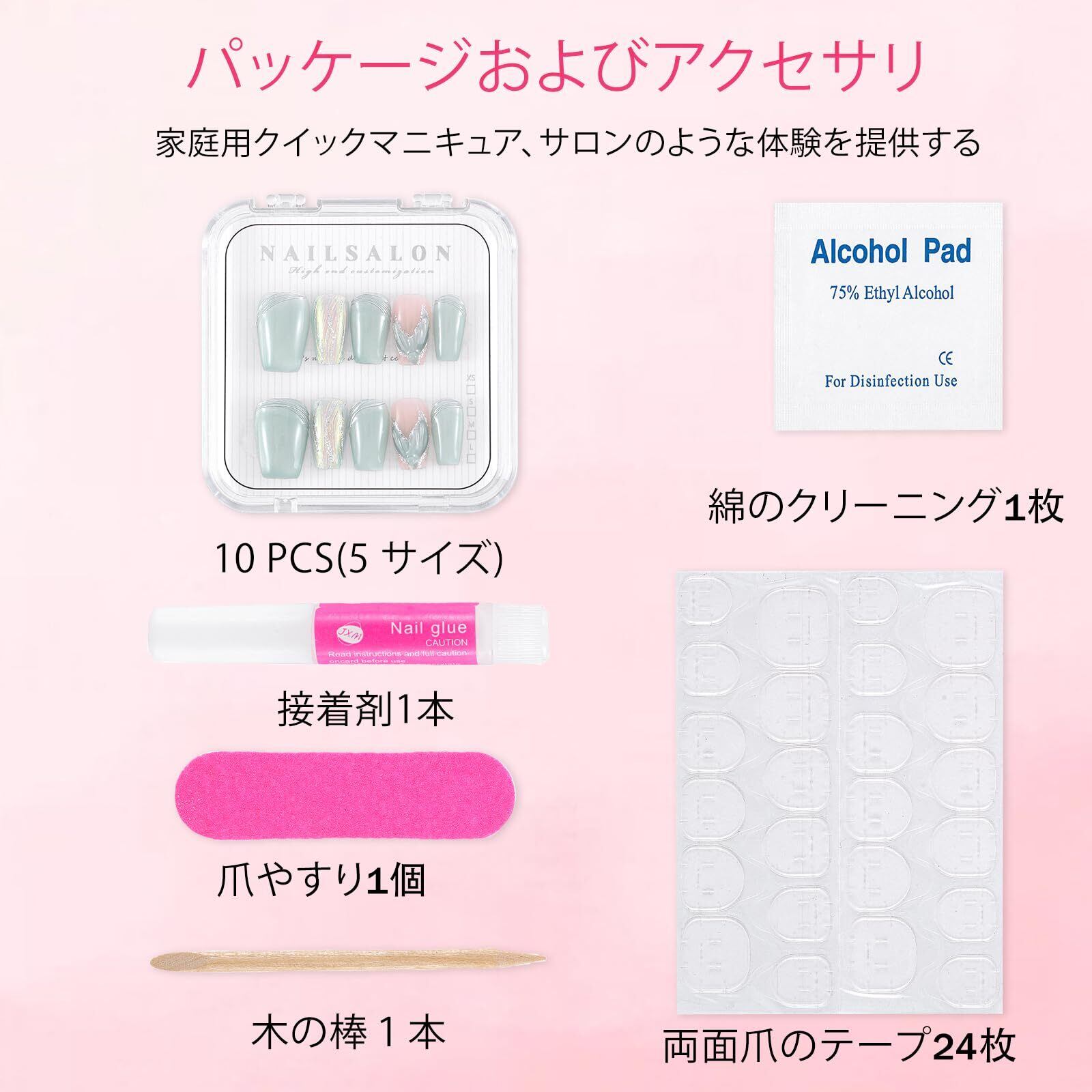 【パッケージ】10個の手作りネイルには梱包箱が付属しており、その中には両面爪のテープ24枚、爪やすり1個、綿のクリーニング1枚、木の棒1本、ネイル接着剤1本が含まれています。