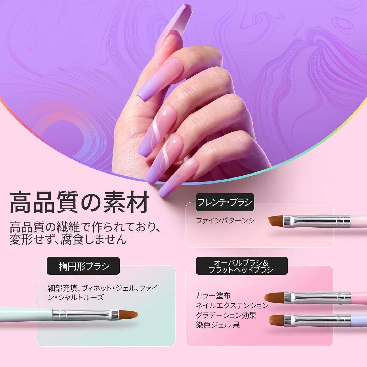 6 点セットにはネイルエクステンション用ジェルブラシ、デザイン用ライナーブラシ、ドットペンなどを収録。細部作業やネイルアートに最適で、マカロンカラーとキャンディカラーの美しいデザイン。初心者からプロまで幅広く使用可能です。